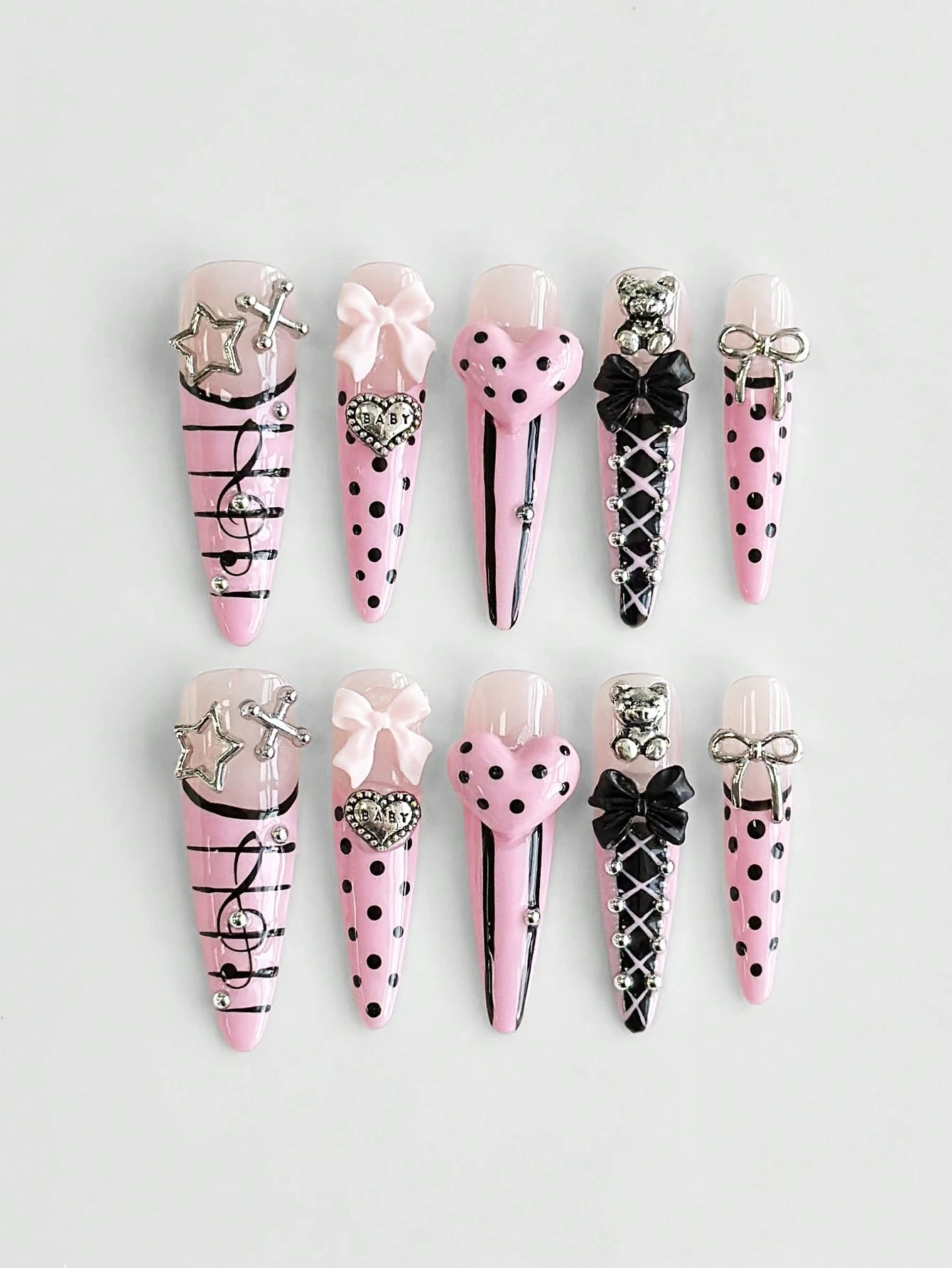 Anime 10pcs Cute Bowknot Music Note Star Element High Quality Handmade False Nails + 3pcs Double-Sided Adhesive, Y2K French Style Rhinestone Chain Polka Dot Removable Nail Art Stickers, Suitable For Holidays, Parties, Dancing And Daily Wear