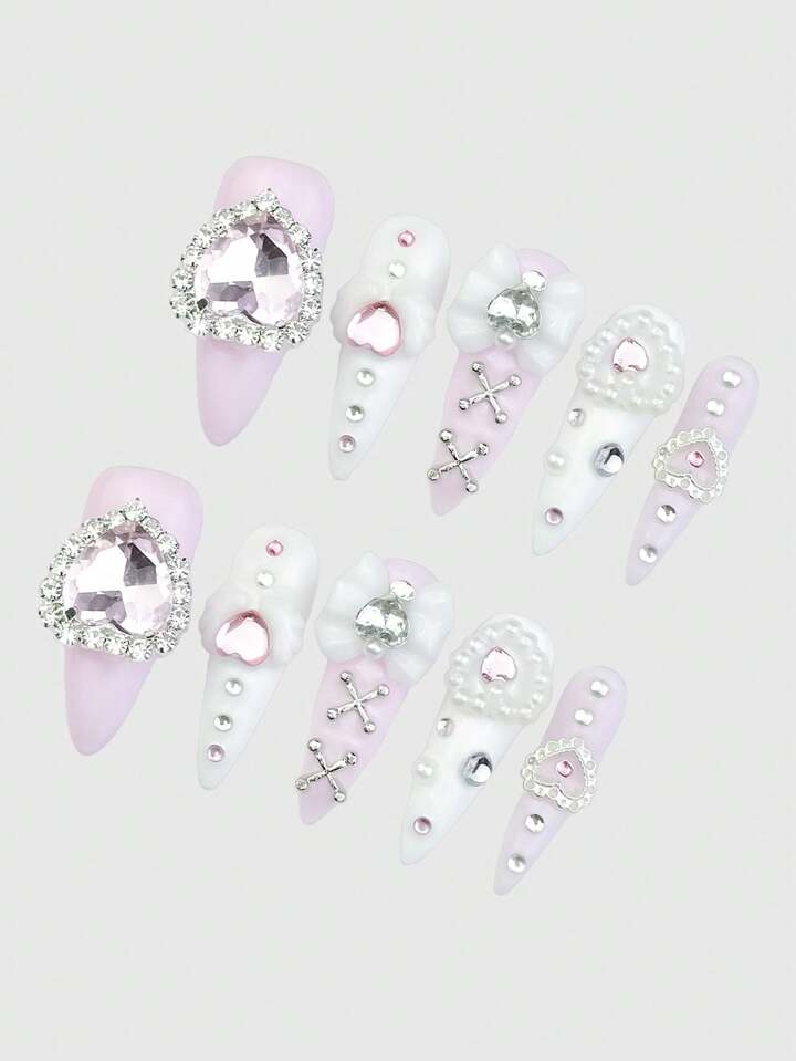 Anime 10pcs Y2K Style Cute Heart & Bow Fake Nail Arts With 1pc Nail Tape
