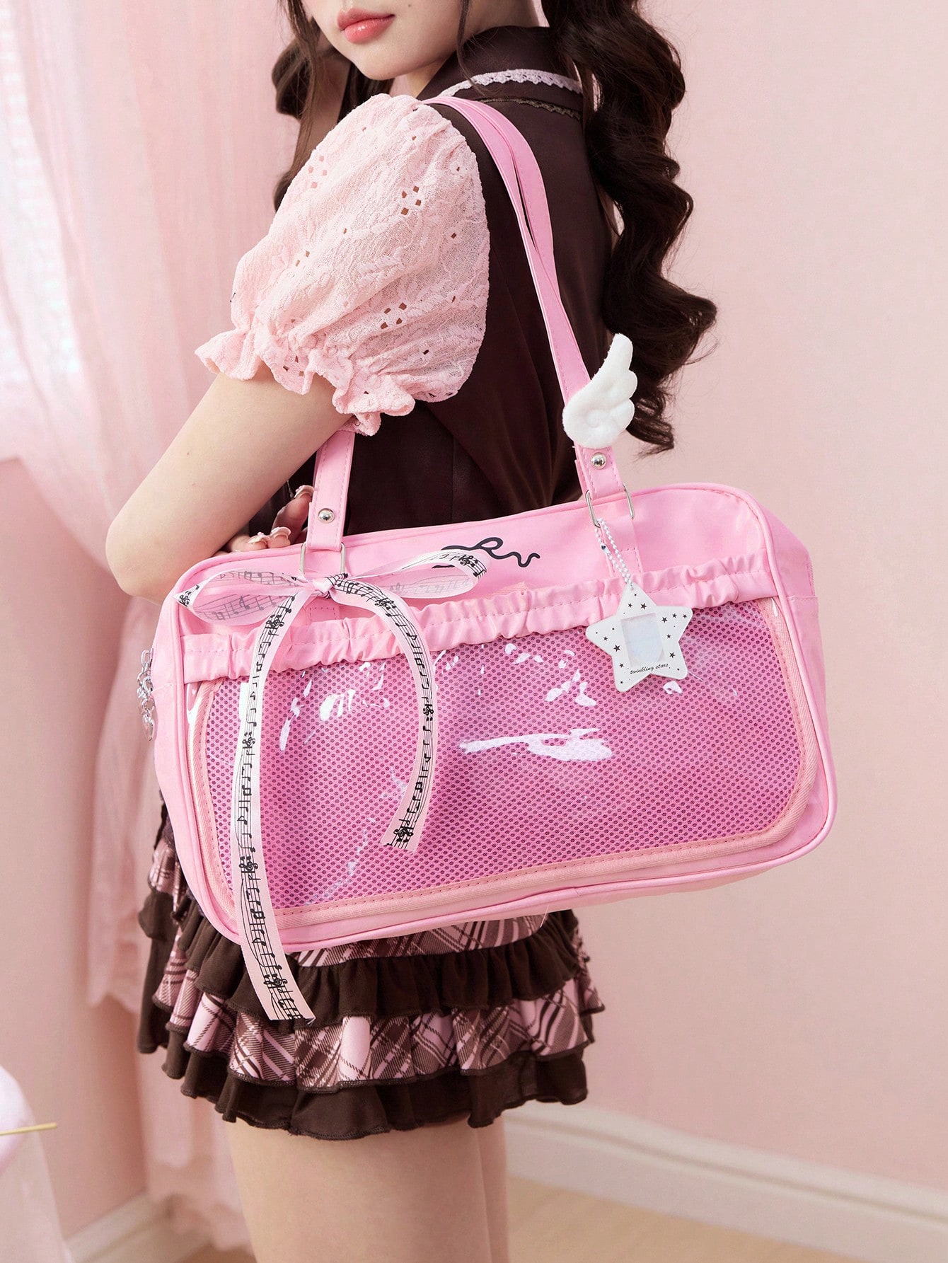 Anime 1pc Cute Sweet Bow Heart Lace Patchwork Polka Dot Pop Art Women Tote Bag, 2nd Gen Snack Quantity Music Note Music Festival Transparent Layer Badge Doll Display Shoulder Bag, Suitable For Shopping, Campus