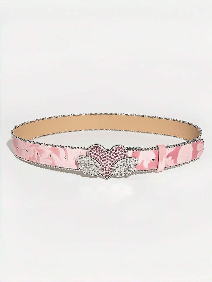 Anime 1pc Y2K/Millennium Style Floral Embroidery Heart Crystal Angel Wing Buckle Girdle/Belt For Women, Sakura Pink