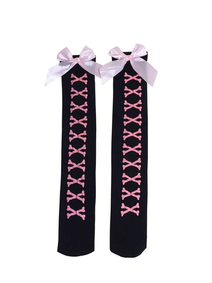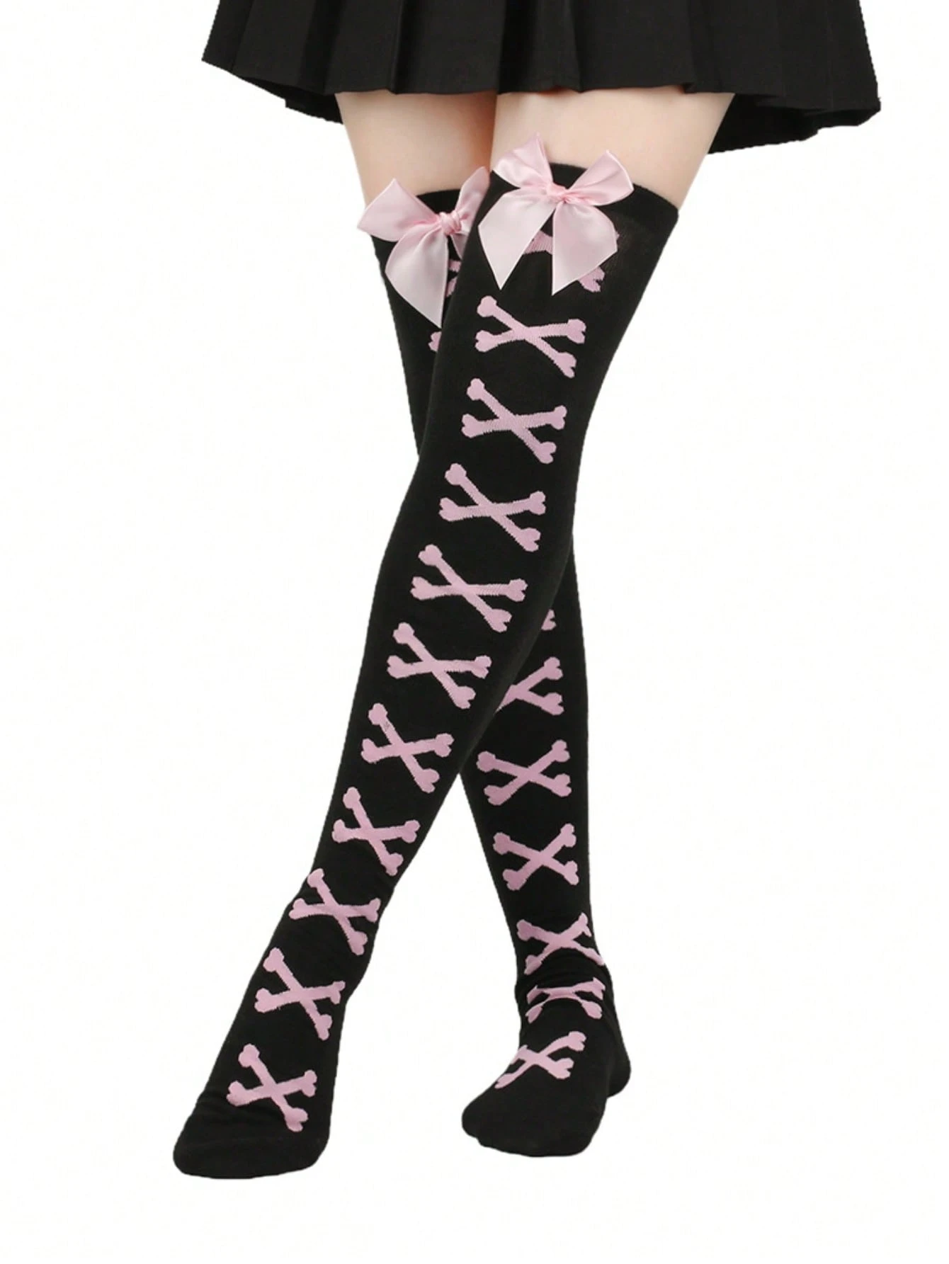 Anime 3 Pairs Punk Thigh High Socks With Bow & Bone Design, Comfortable & Stylish Streetwear Aesthetic