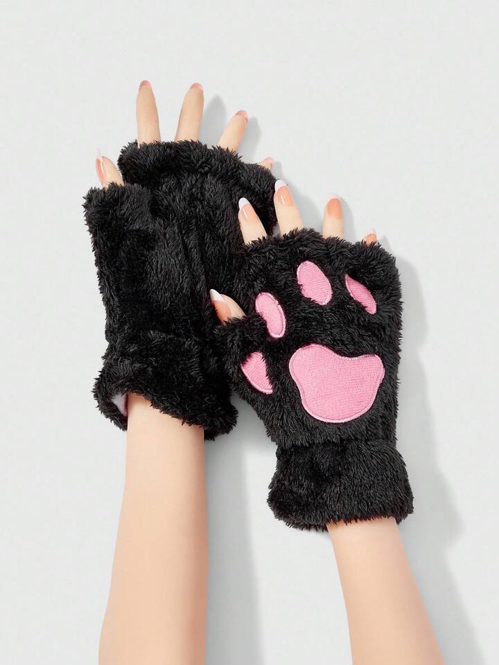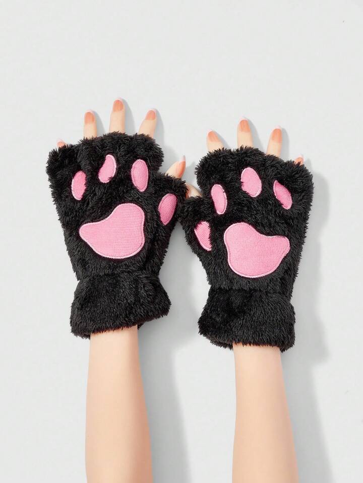 Anime Black Cute Cat Paw Fingerless Gloves, Casual Outdoor Warm Half Finger Gloves For Autumn/Winter Cosplay