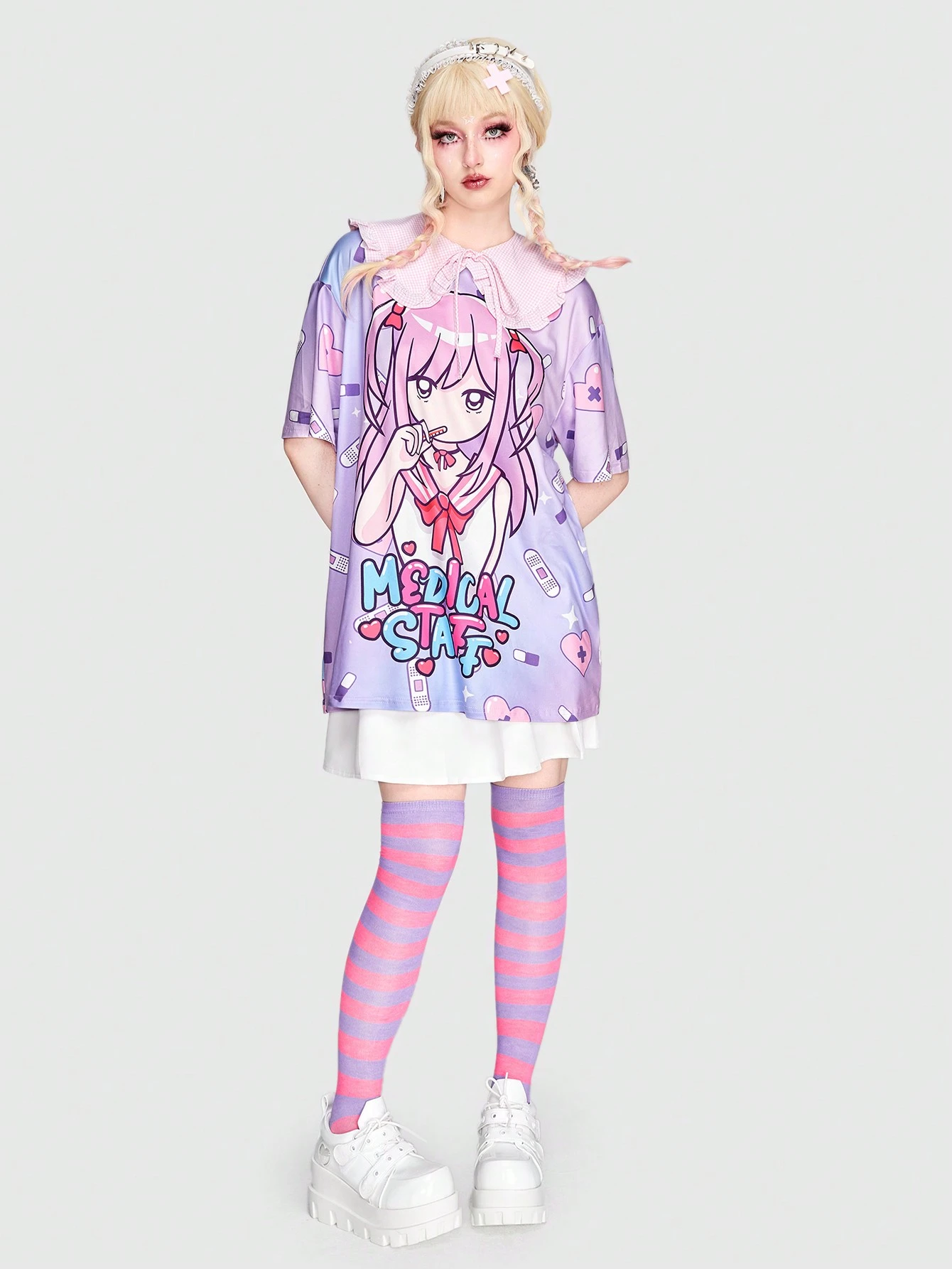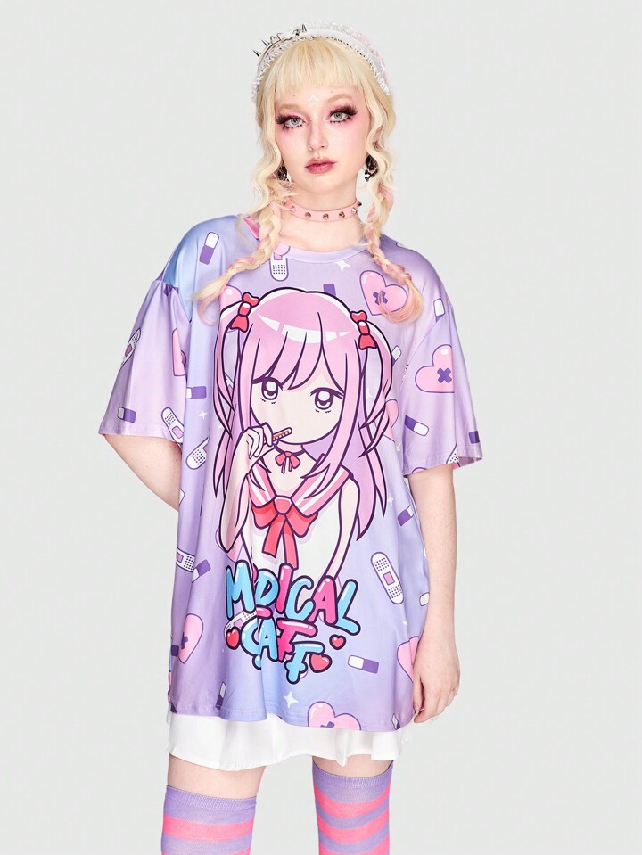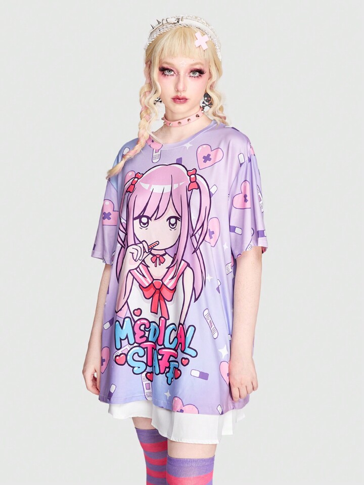 Anime Cartoon Figure Graphic Round Neck Drop Shoulder Tee