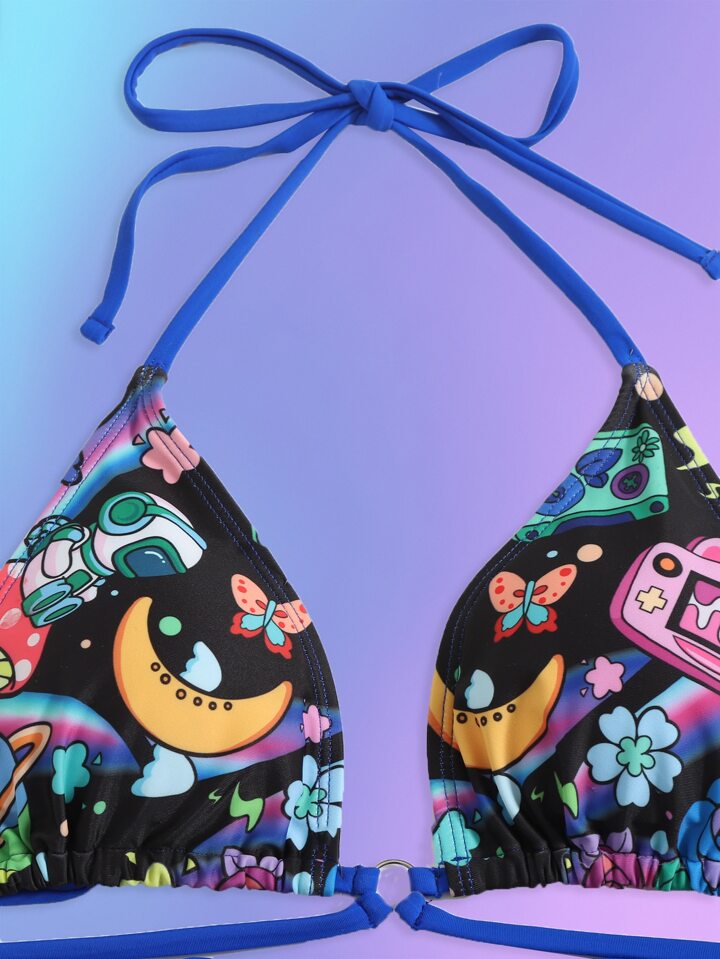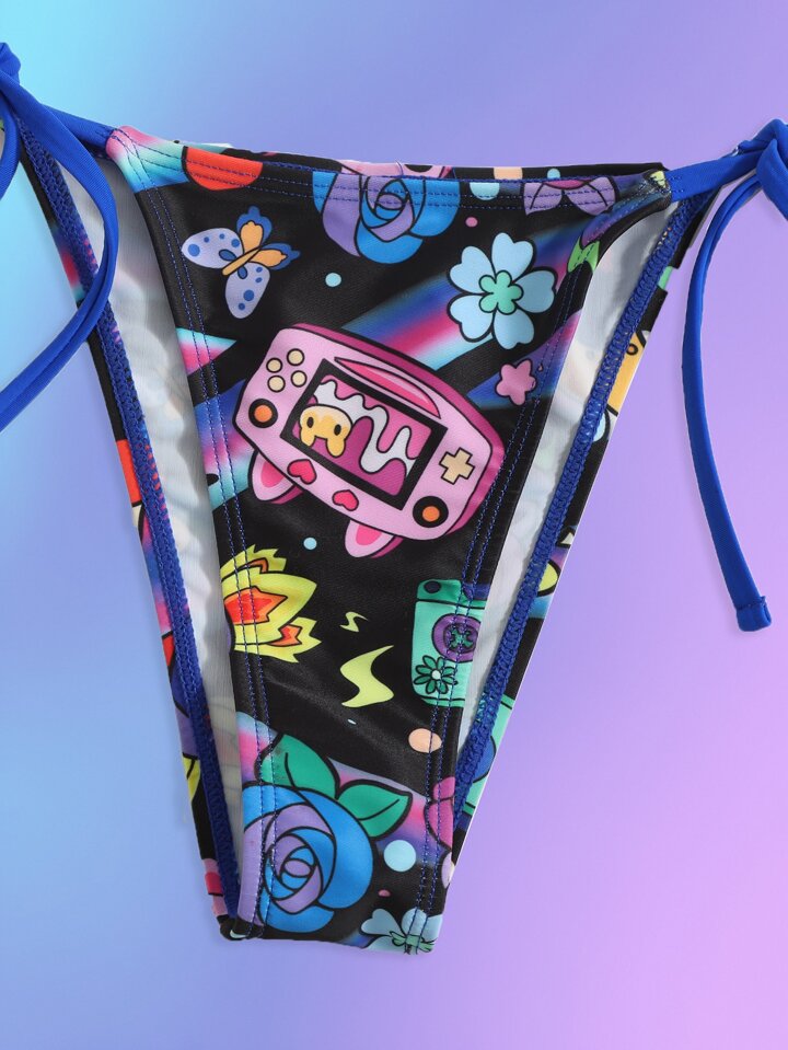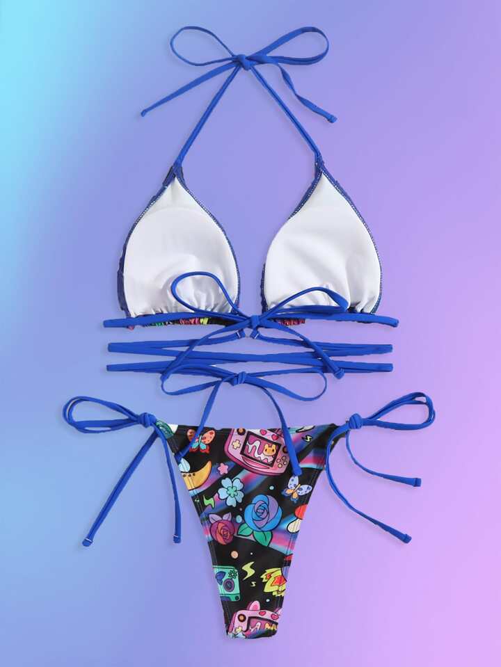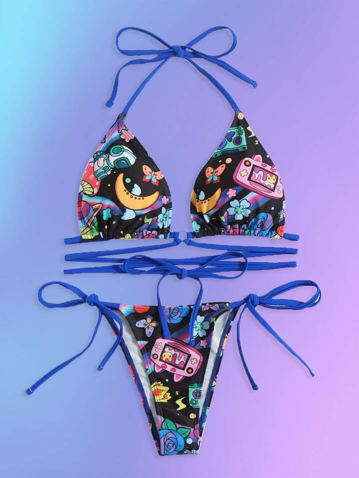 Anime Cartoon Print Criss Cross Halter Tie Side Summer Beach Bikini Set