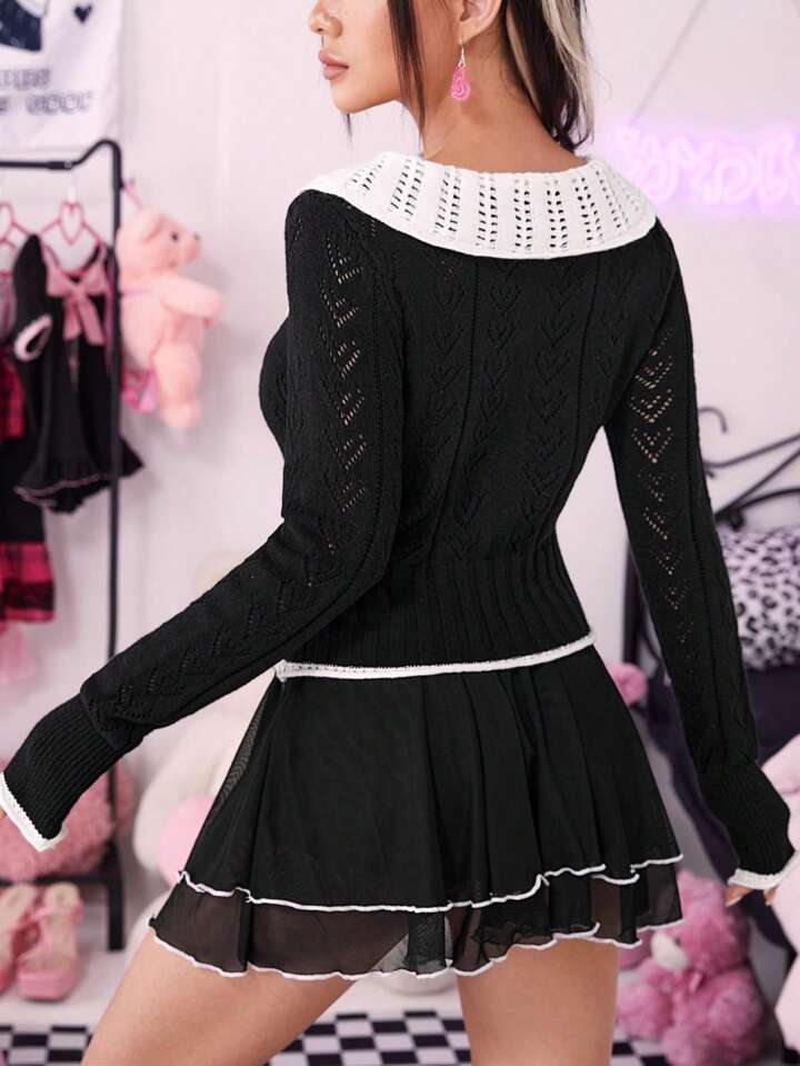 Anime Contrast Collar Tie Front Pointelle Knit Cardigan
