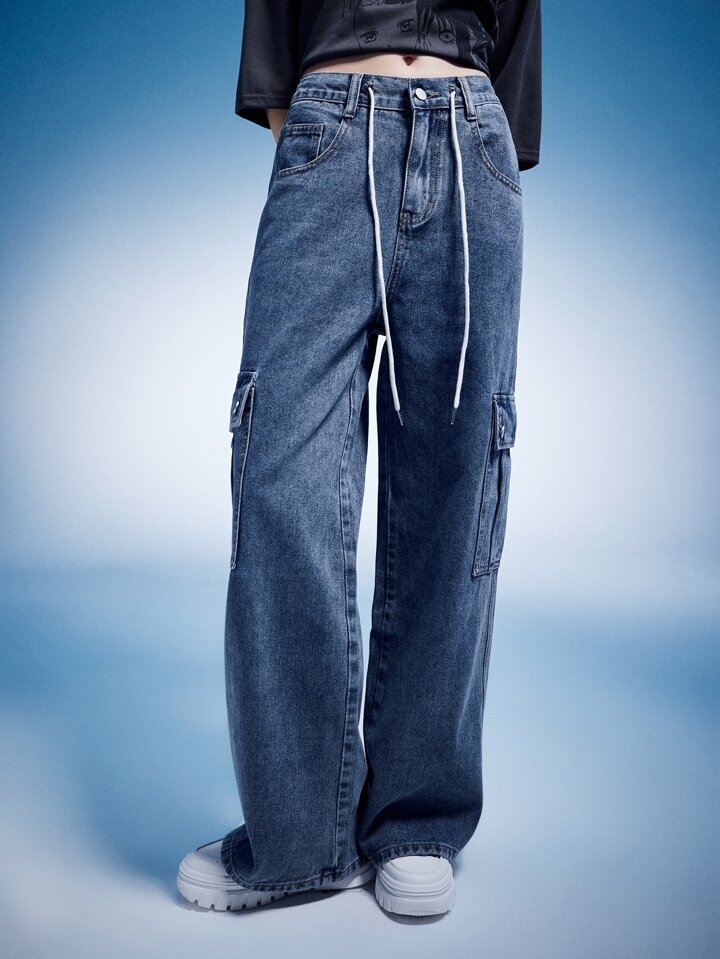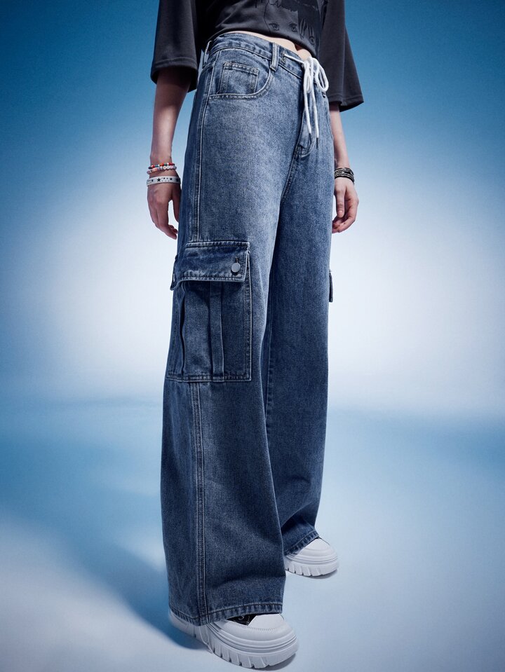 Anime Drawstring Flap Pocket Cargo Jeans