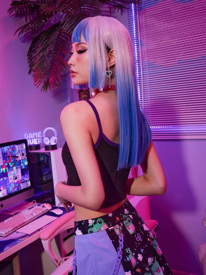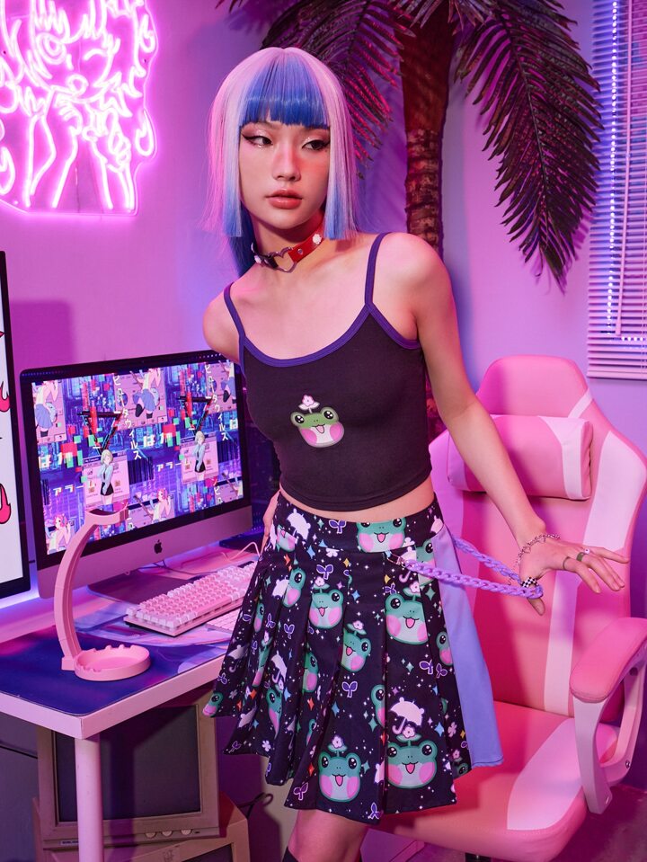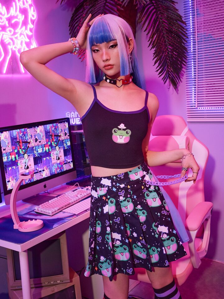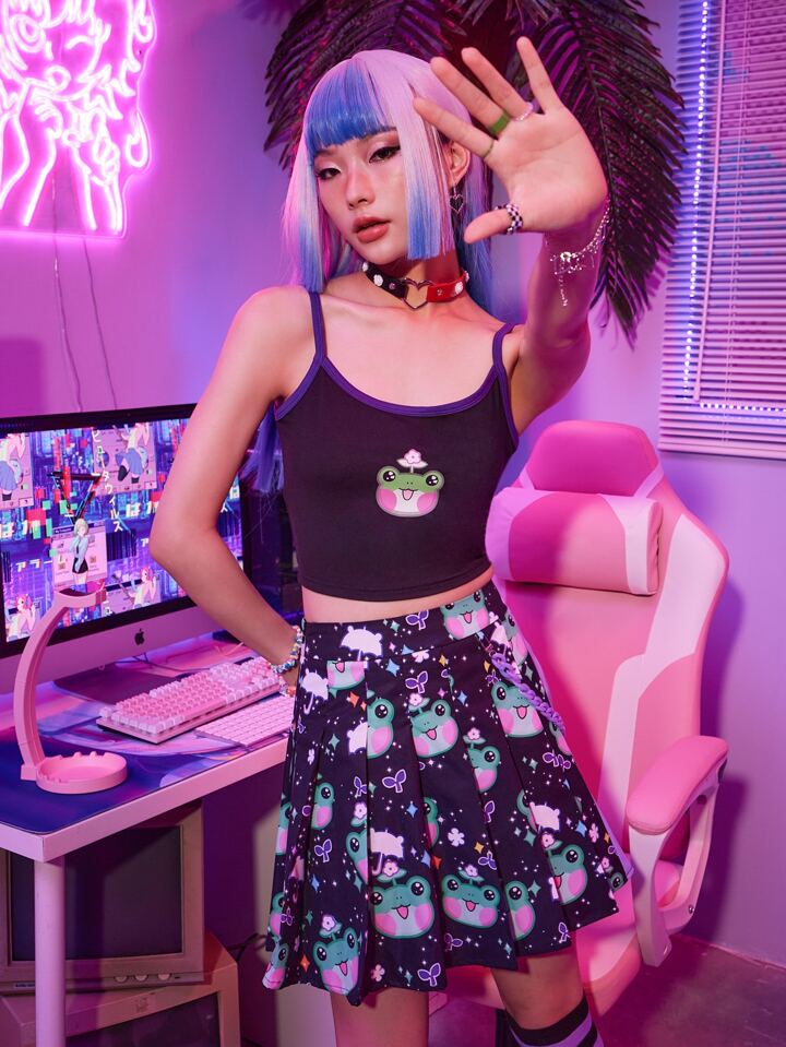 Anime Frog Print Contrast Binding Cami Top