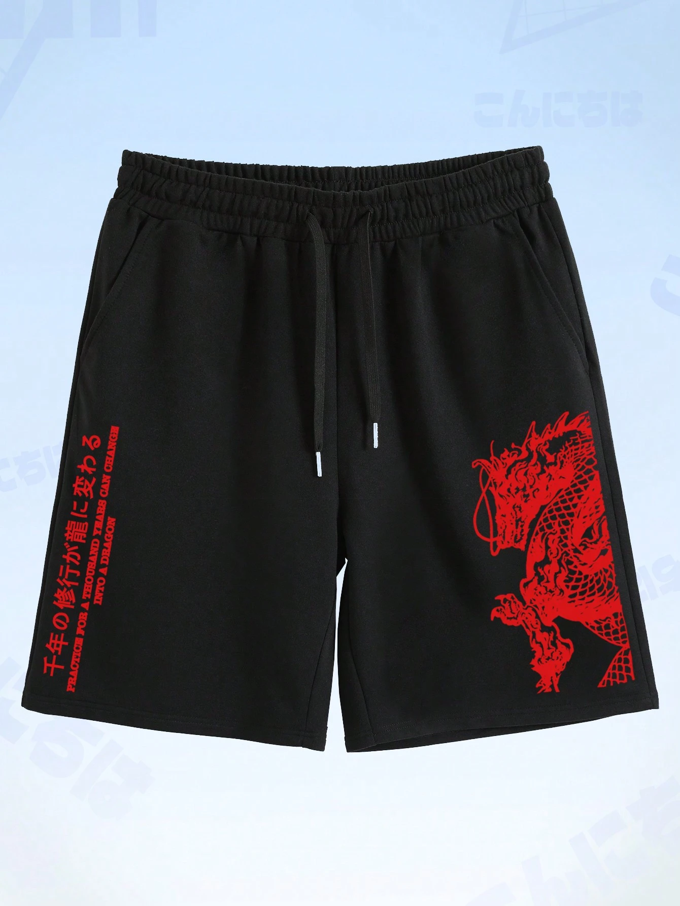 Anime Guys Dragon & Slogan Graphic Drawstring Waist Shorts