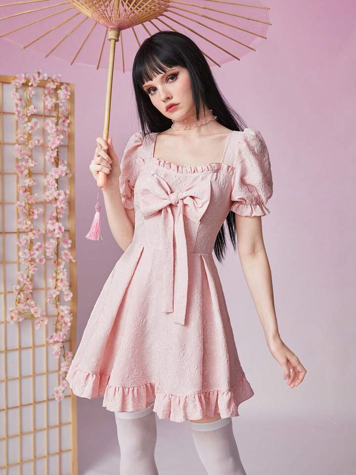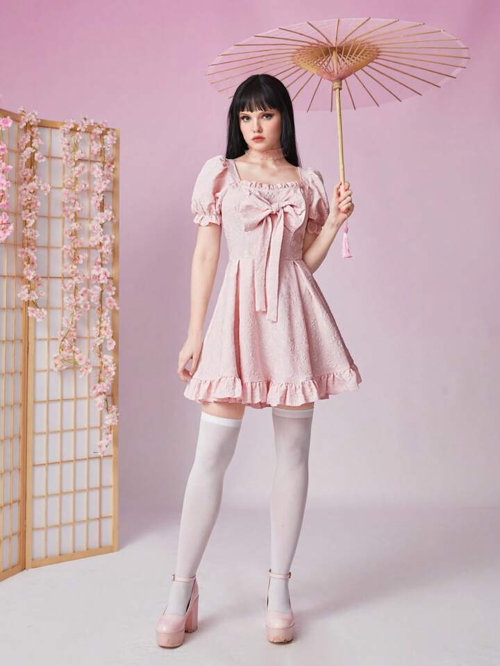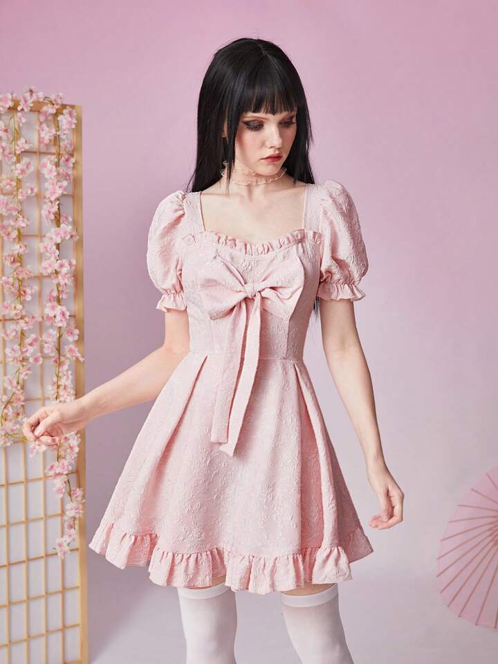 Anime Jacquard Bow Front Ruffle Hem Dress