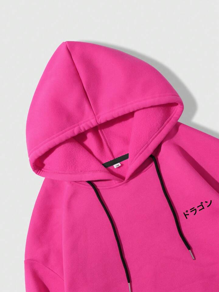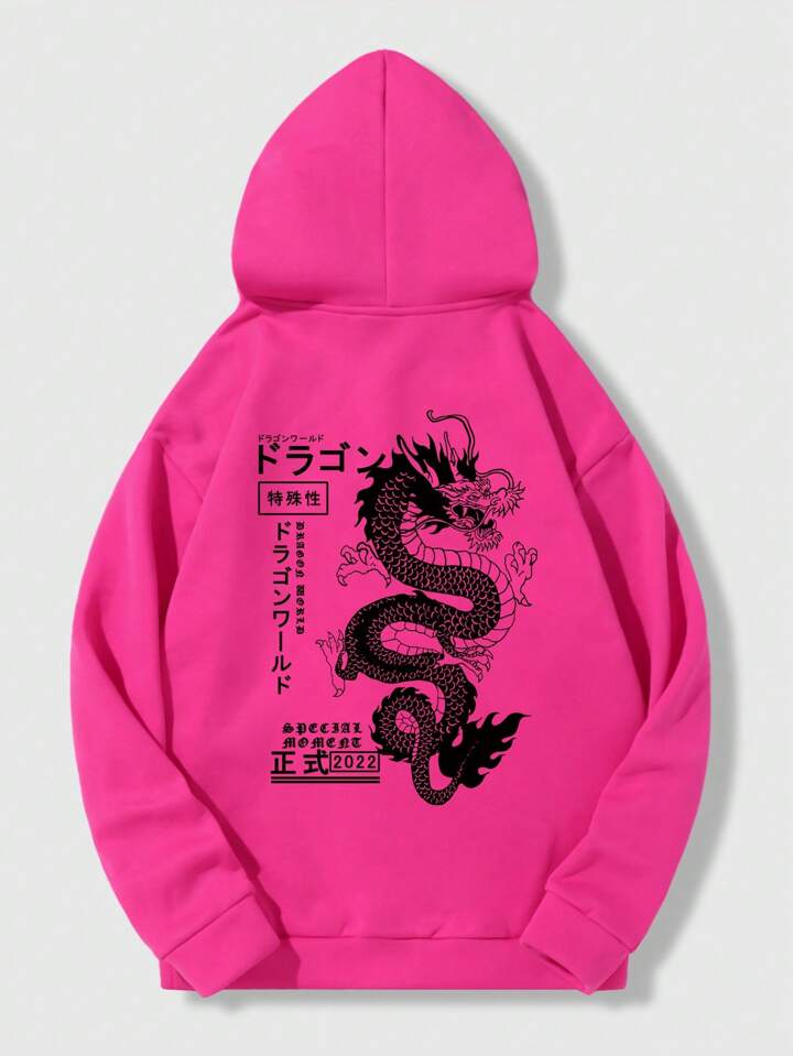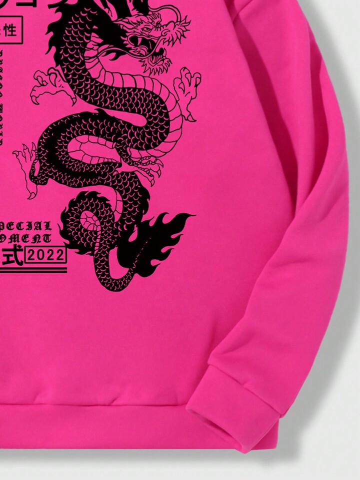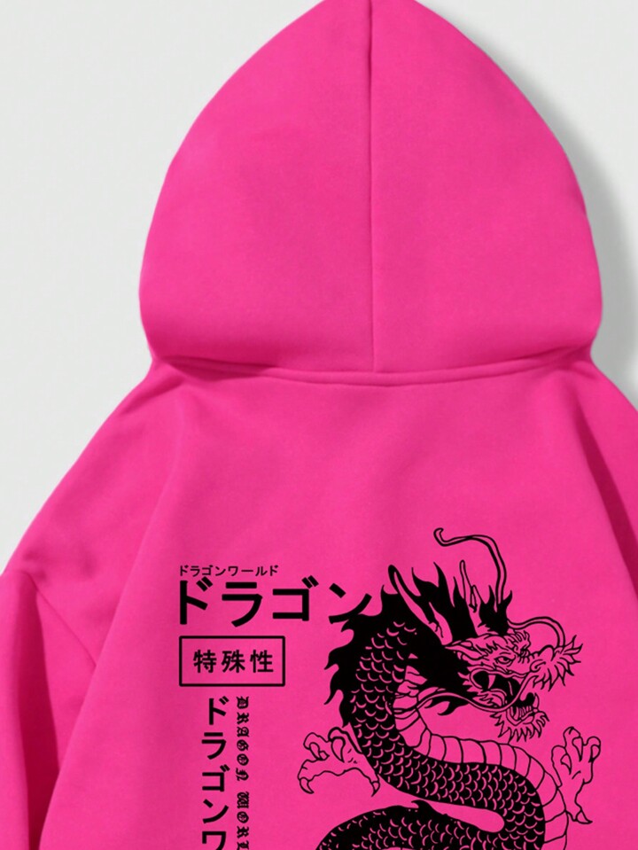 Anime Men Hooded Fleece Sweatshirt With Dragon & Letter Print And Drawstring