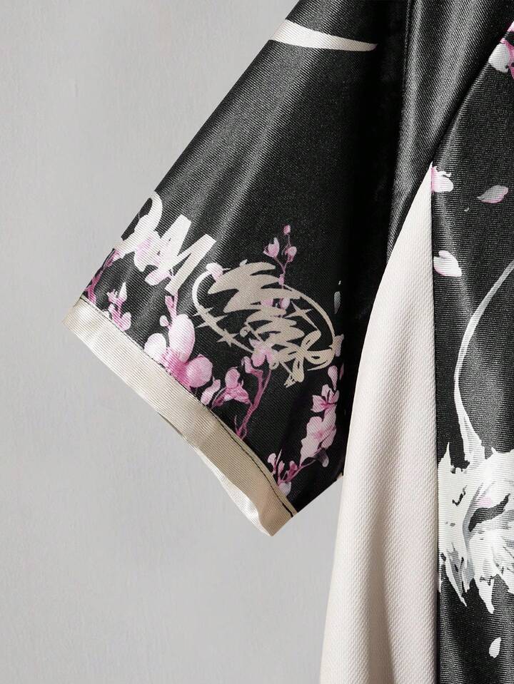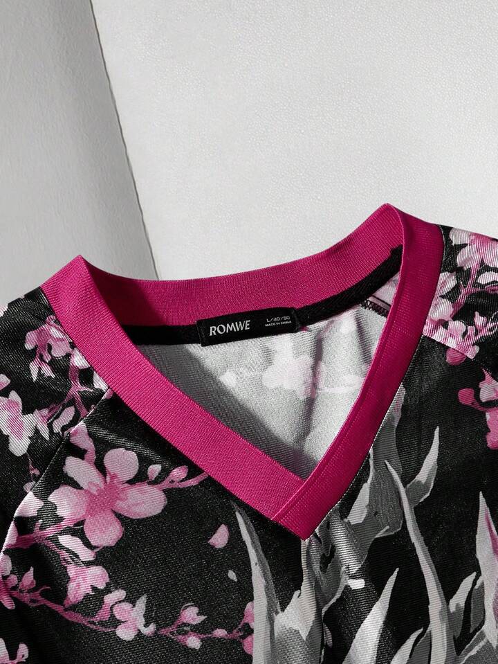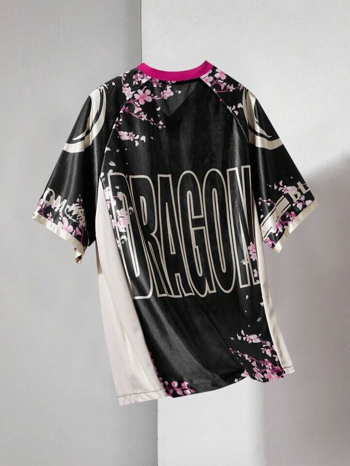Anime Men's Blossom Sakura Dragon Print V-Neck Raglan Short Sleeve Casual Loose T-Shirt
