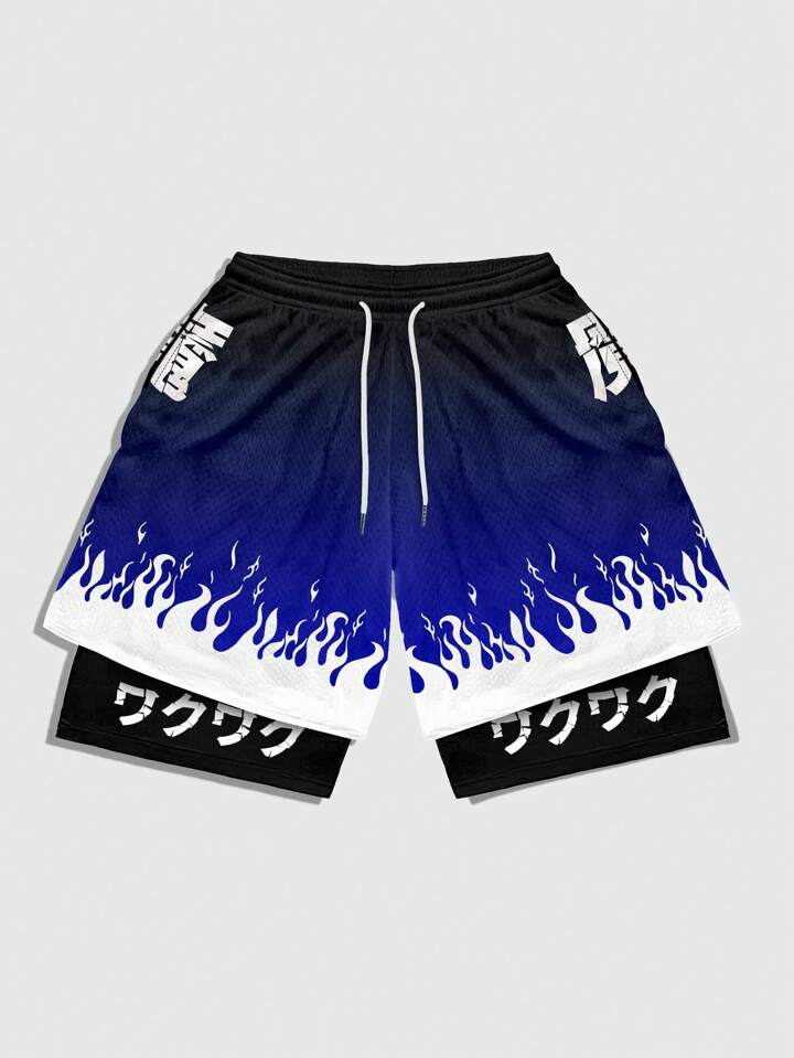 Anime Men's Casual Ombre Flame Print Drawstring Waist Basketball Shorts