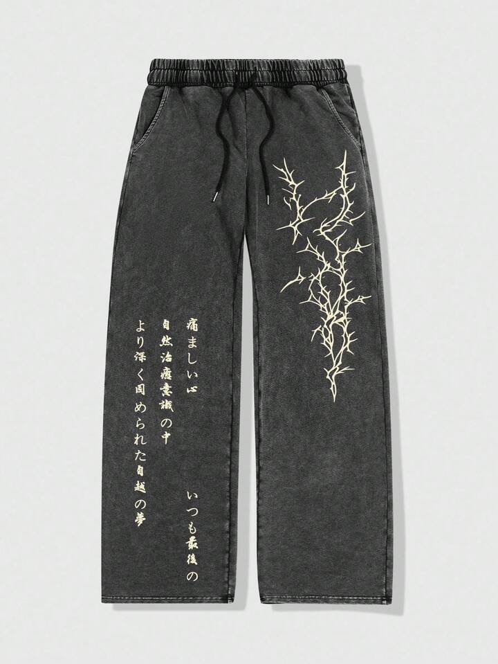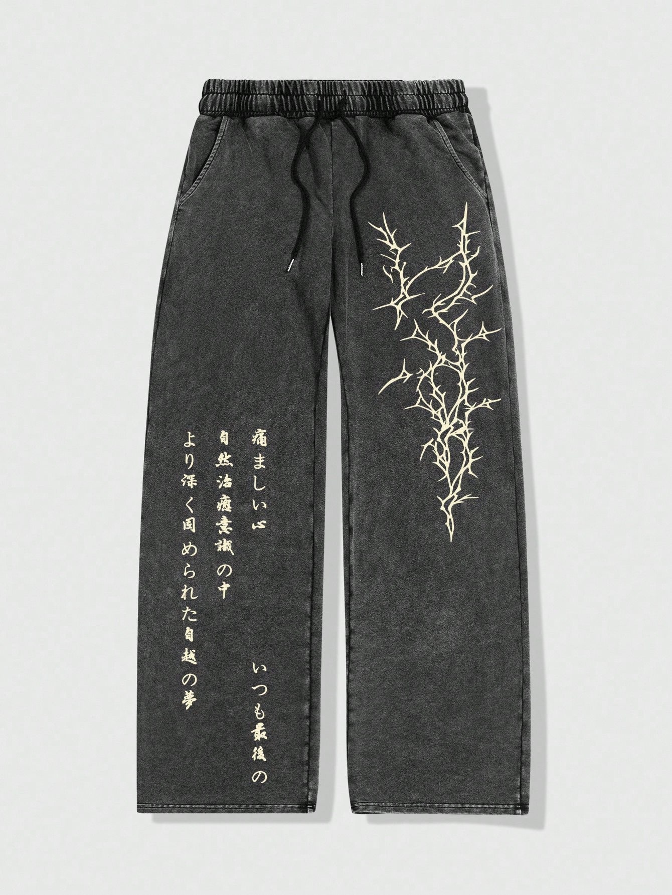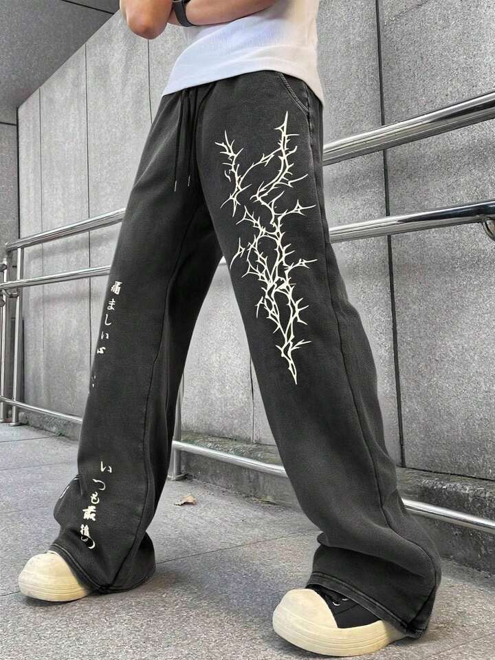 Anime Men's Slogan Print Drawstring Waist Pocket Straight Leg Japan Style Sweatpants, Fall