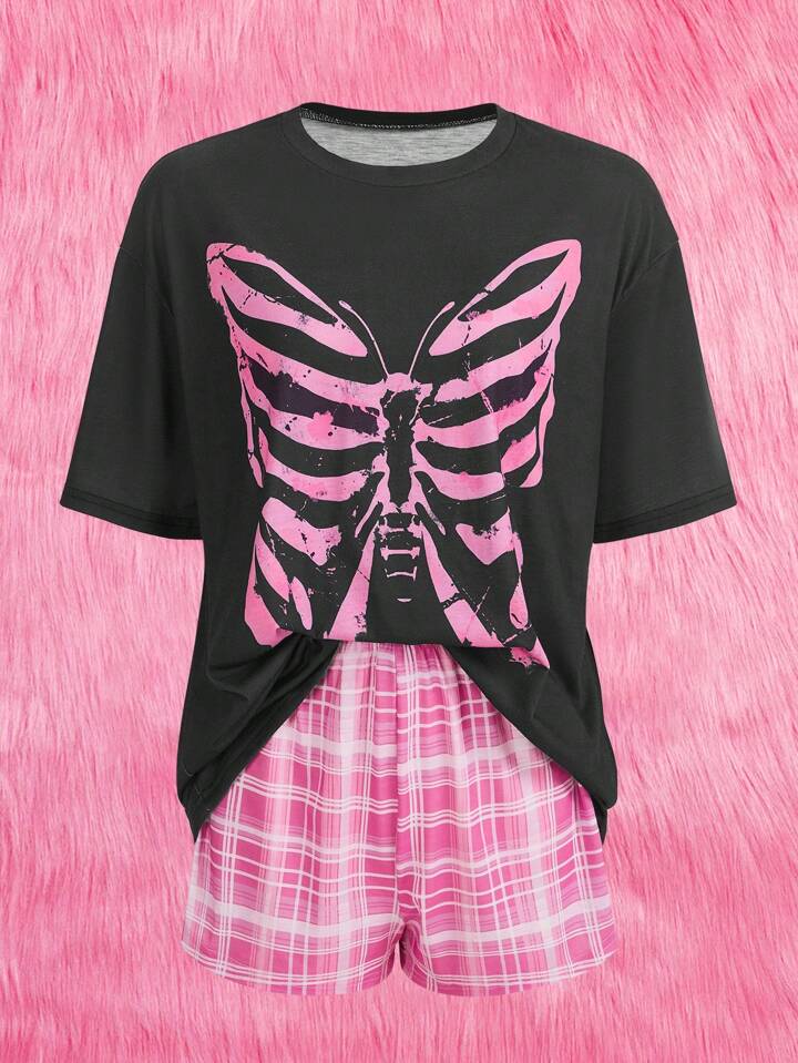 Anime Skeleton Print Tee & Plaid Shorts PJ Set