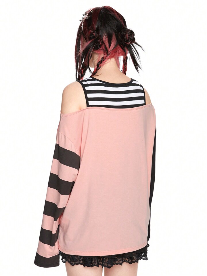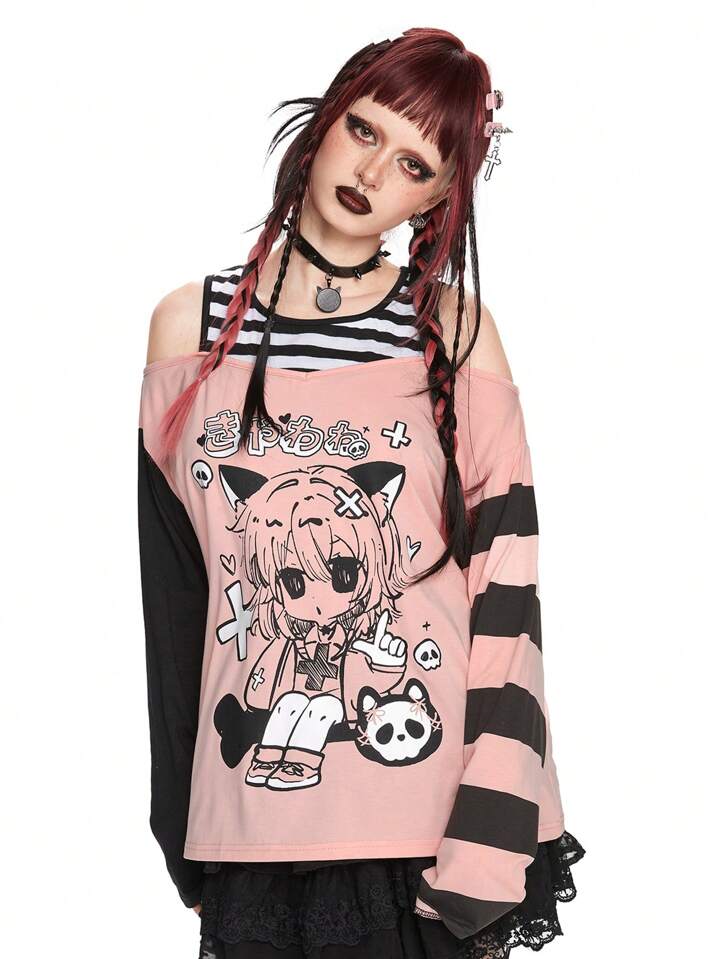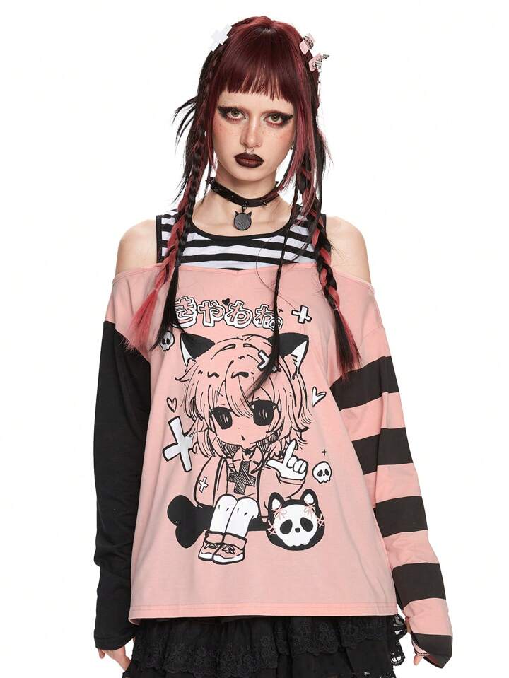 Anime Women's Casual Loose Fit Letter & Cartoon Girl Print Open Shoulder Long Sleeve T-Shirt