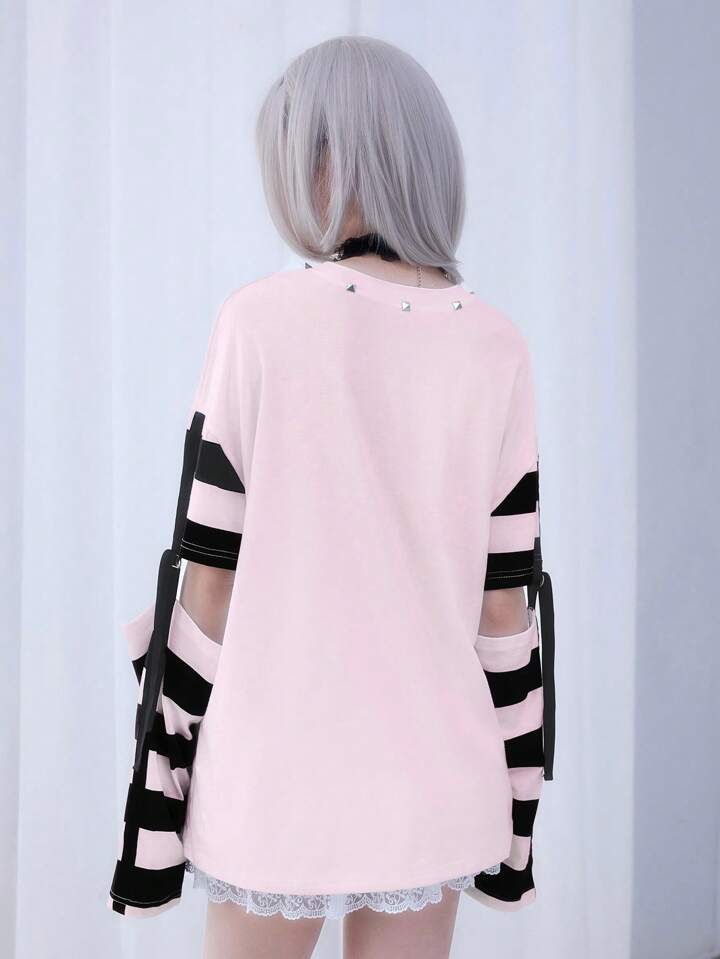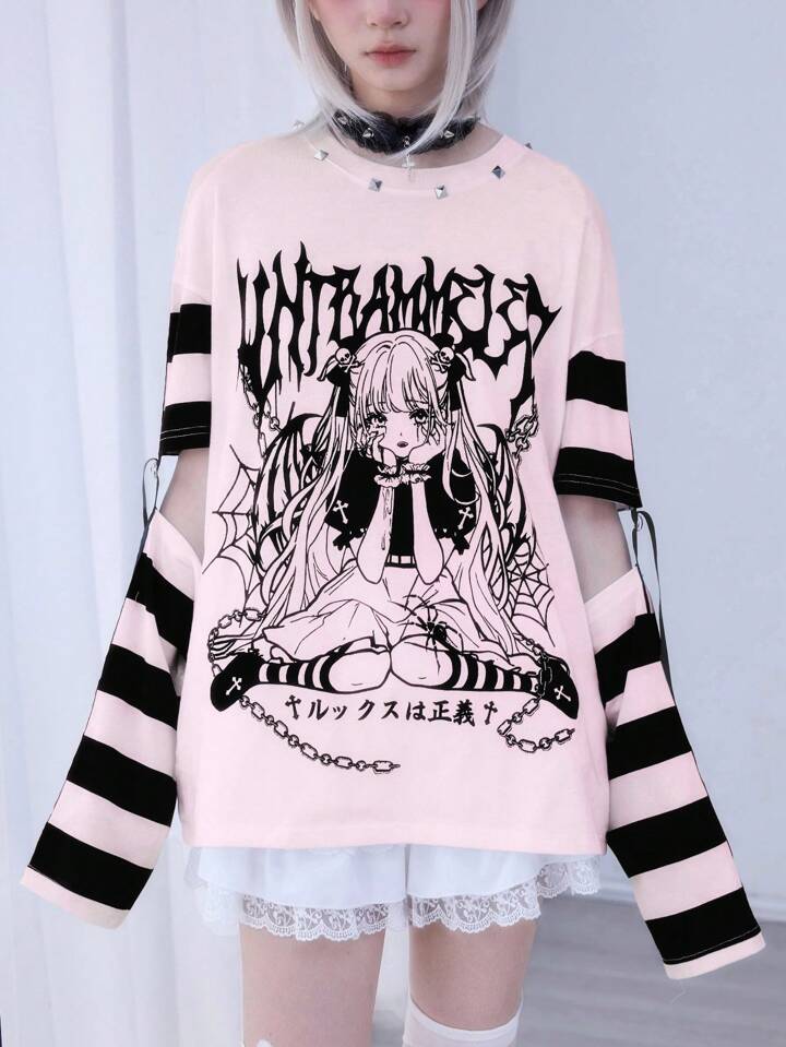Anime Women's Cute Stripe Patchwork Cartoon Character Print Casual Round Neck T-Shirt
