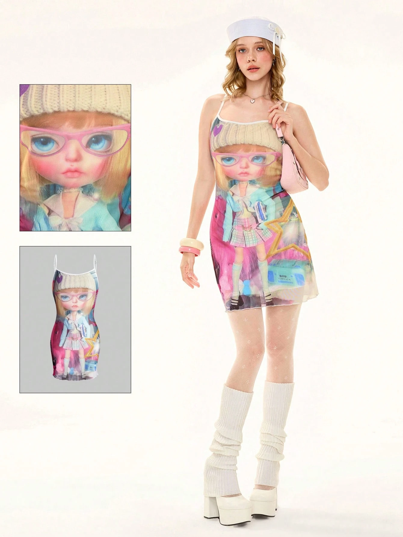 Anime Y2K Fashionable Cartoon Character Print Sexy Sweet Heart Camisole Mini Dress For Women