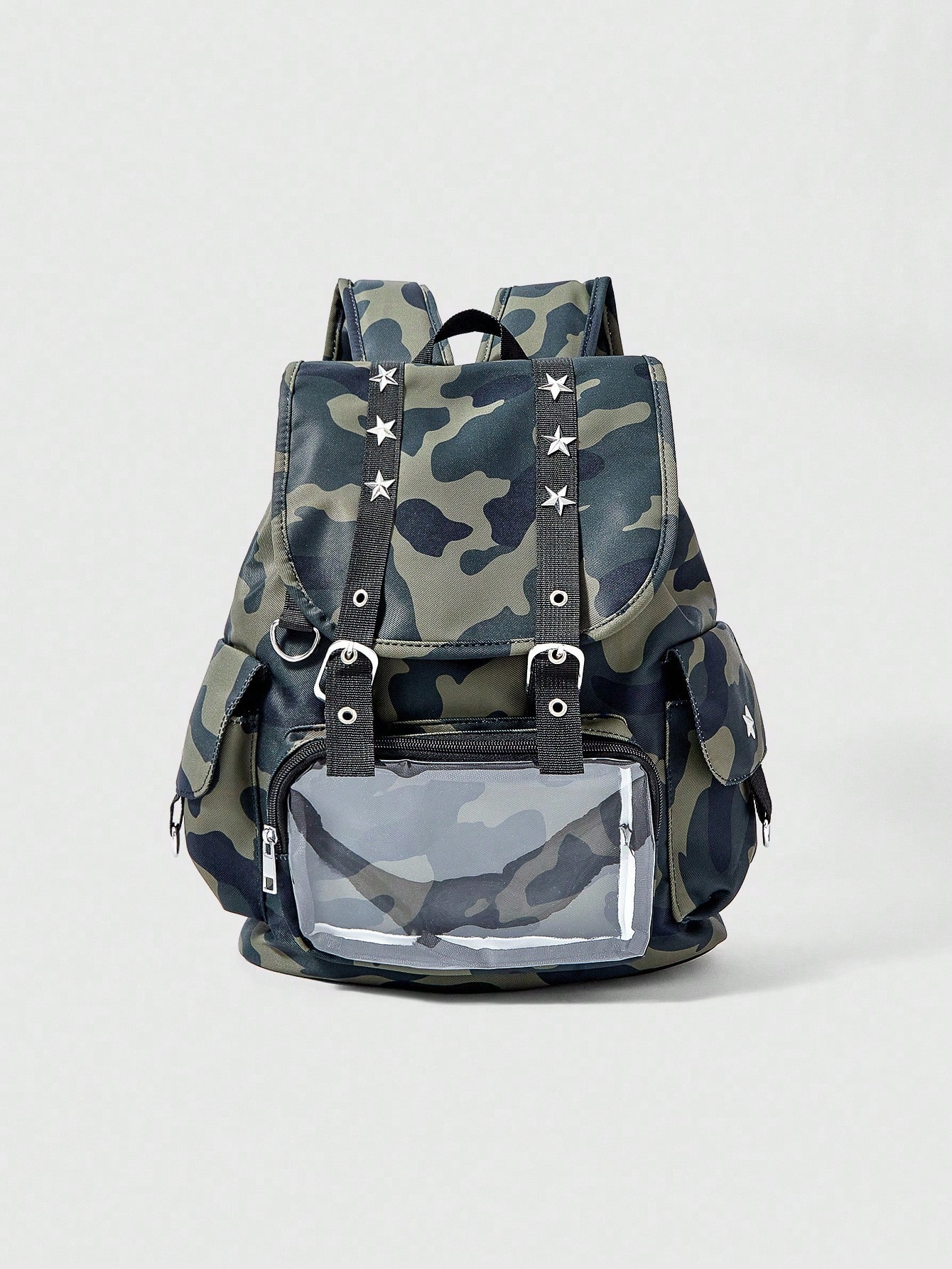 Anime Y2K Punk Metal Star Studded Fashion Large Capacity Flap Women Backpack Minimalist Camo & Leopard Print Transparent Layer Casual Backpack Doll Carrying Display Bag For Outdoor Use