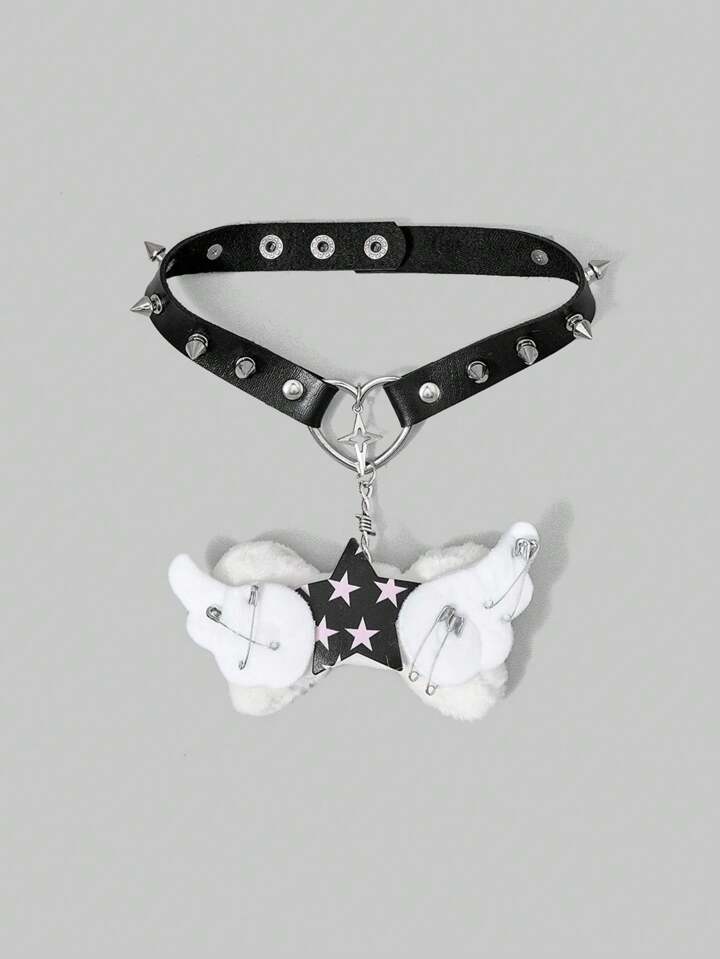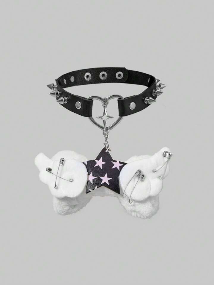Anime Y2K Punk Style Adjustable Necktie With Dark Five-Pointed Star & Bone Wing Design For Women; Gothic Street Studded Heart Pendant Necklace Accessory, Suitable For Costume Play And Street Photography