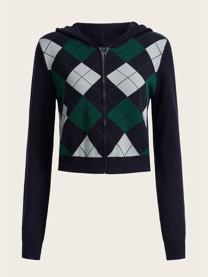Argyle Pattern Zip Up Hooded Cardigan