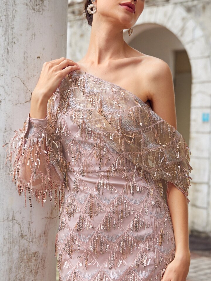 Asymmetrical Neck Split Thigh Sequin Fringe Overlay Dress