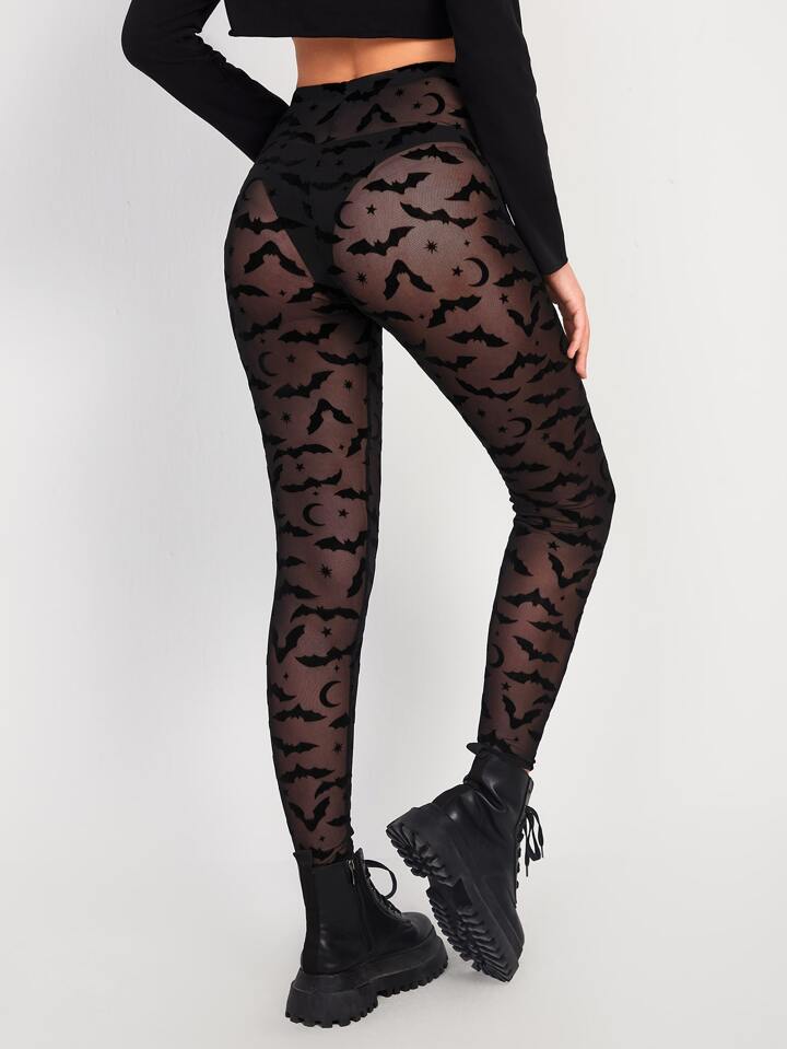 Bat Print Semi Sheer Mesh Leggings Without Thong
