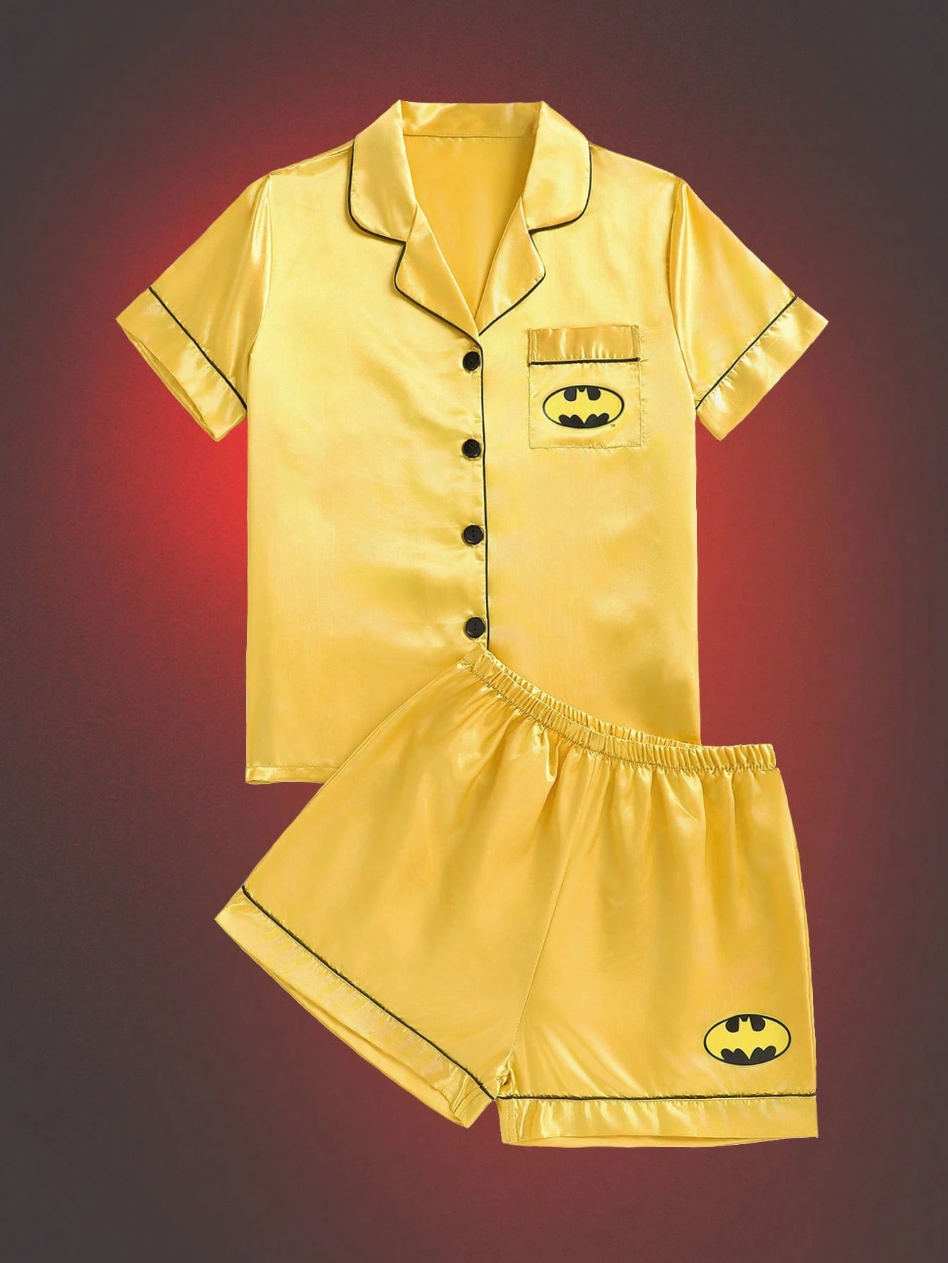 Batman X ROMWE Lapel Neck Bat Print Short Sleeve Top And Shorts Casual Summer Pajama Set