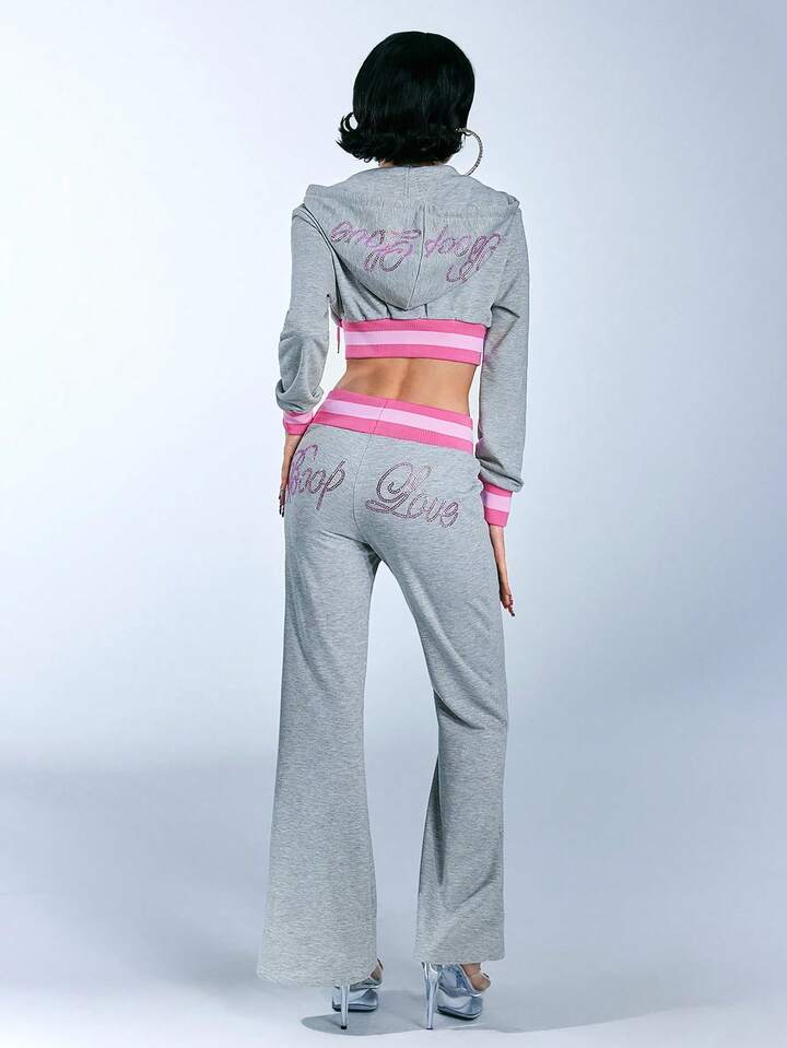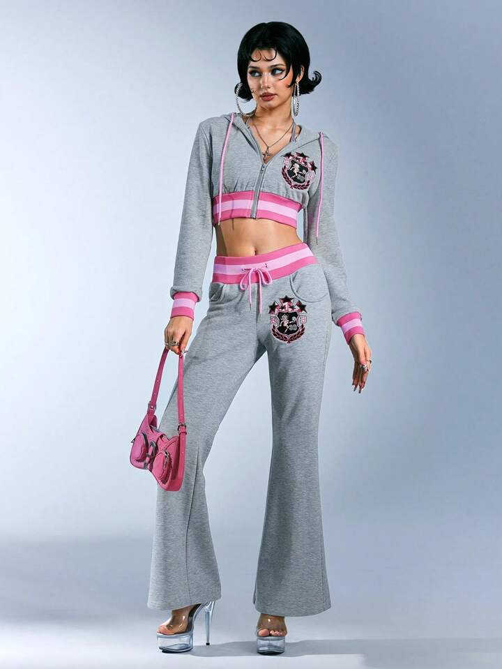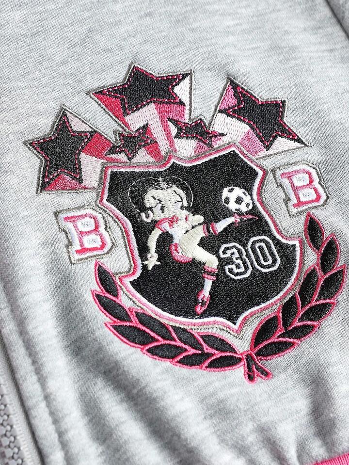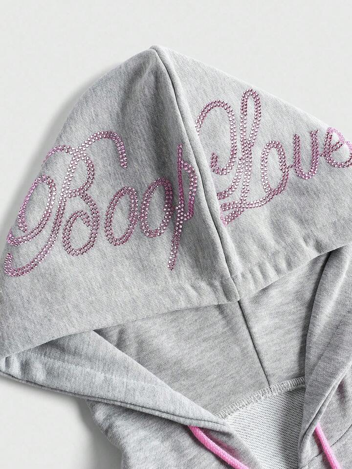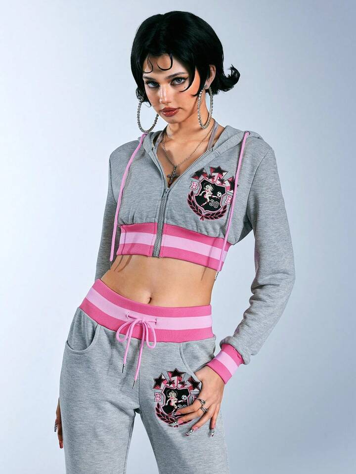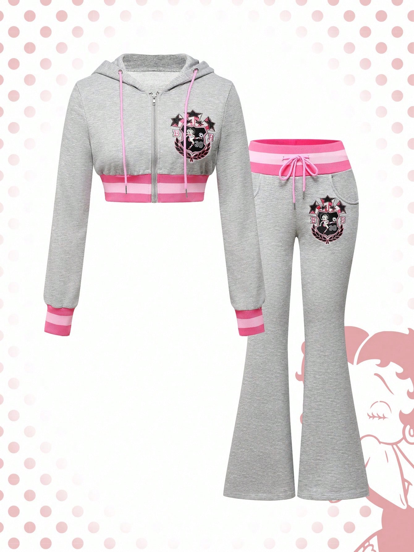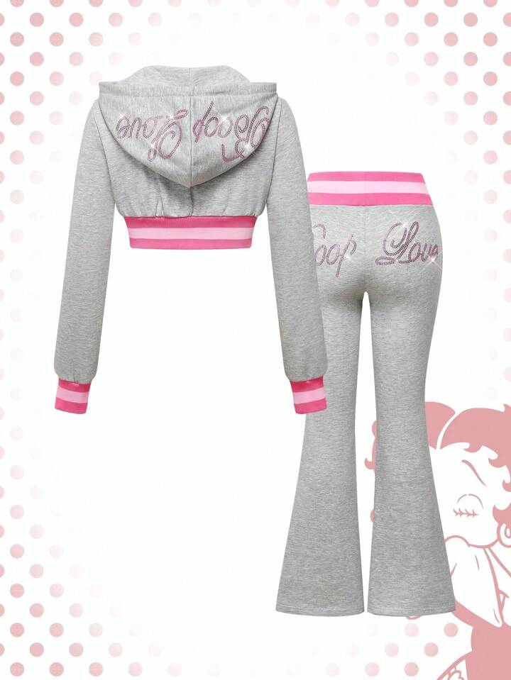 Betty Boop | ROMWE 2pcs Women's Sporty Sexy Embroidery & Rhinestone Sweatshirt And Flare Pants Set