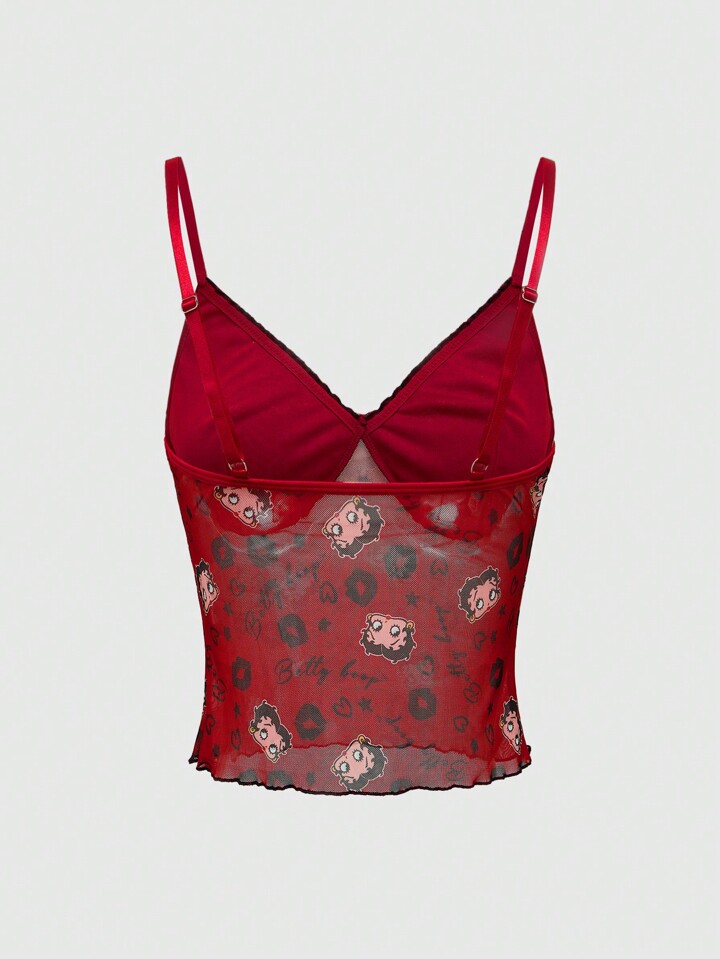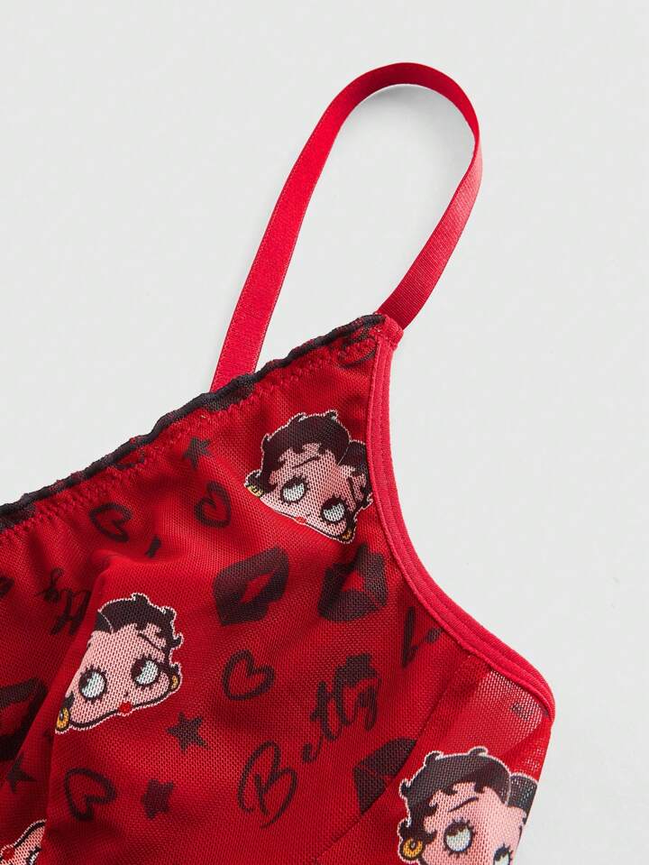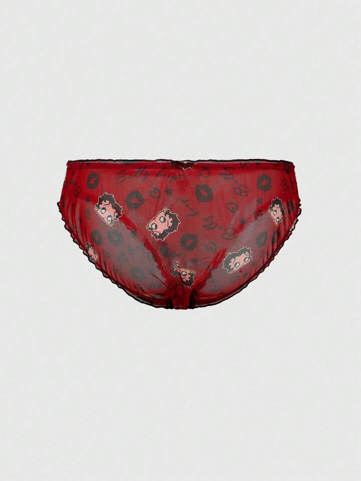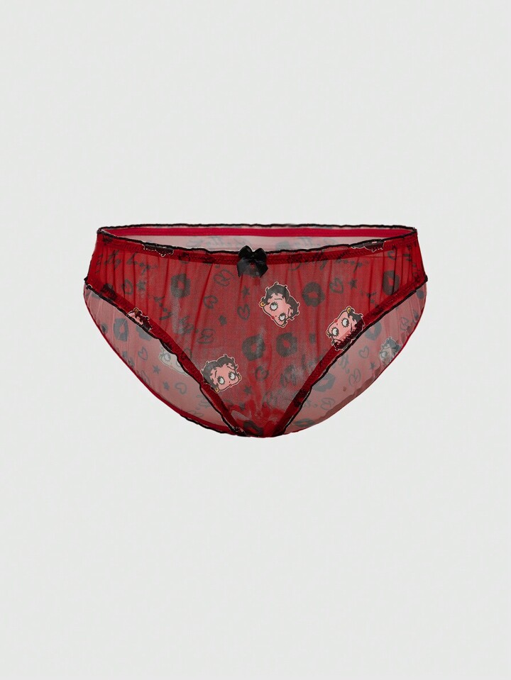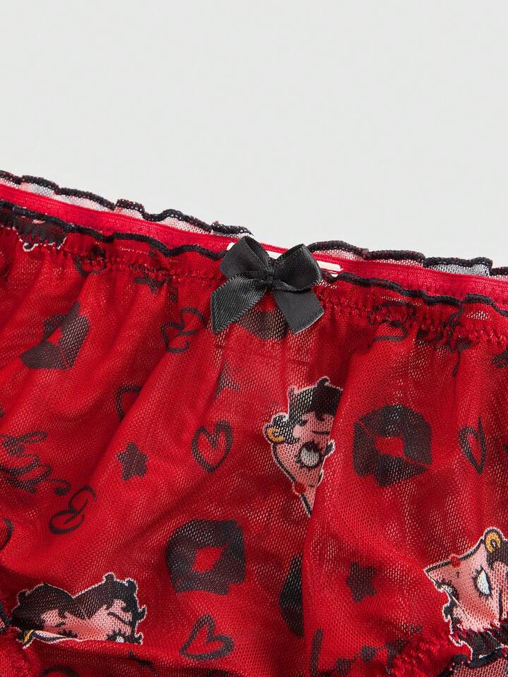 Betty Boop | ROMWE Cartoon Figure And Letter Graphic Contrasting Lettuce Trim Bow Bra And Panty Lingerie Set For Women