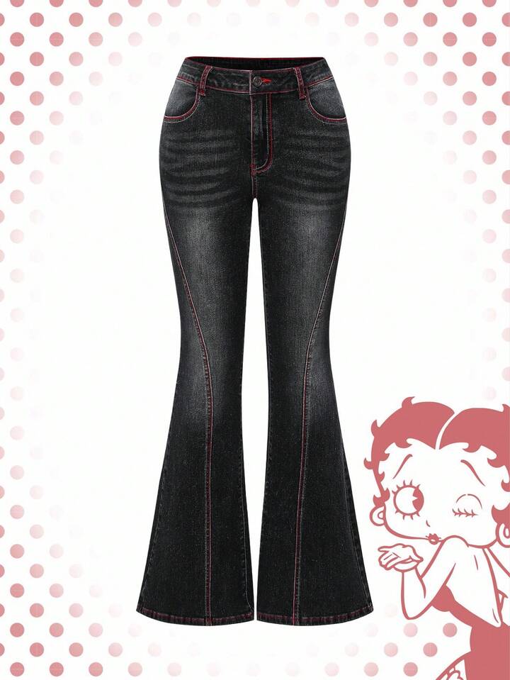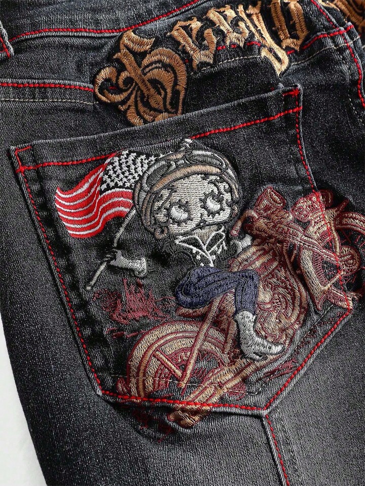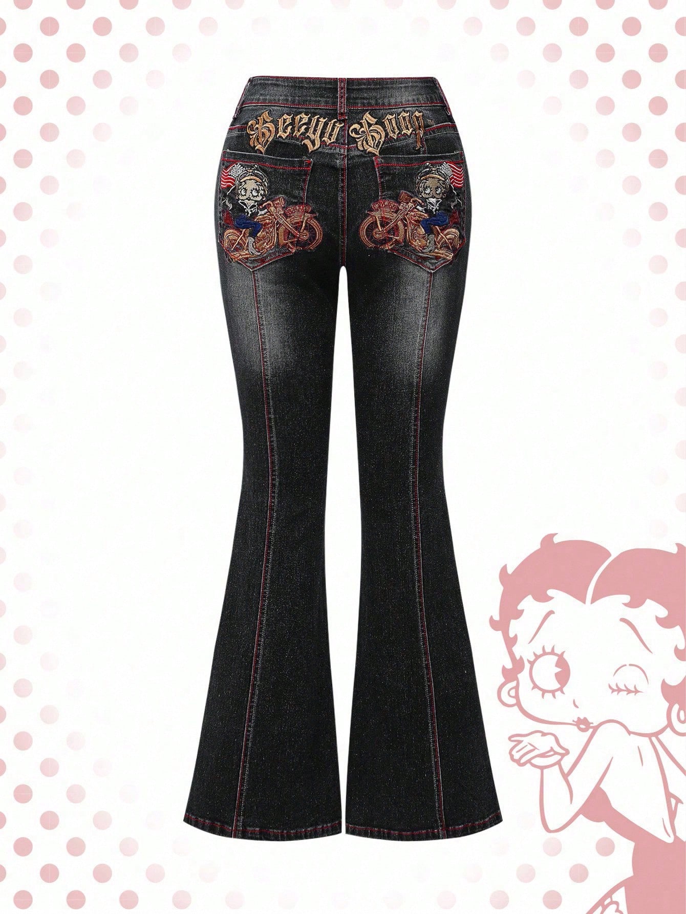 Betty Boop | ROMWE Y2K Babe Cartoon Figure & Motorcycle Embroidery Flare Jeans