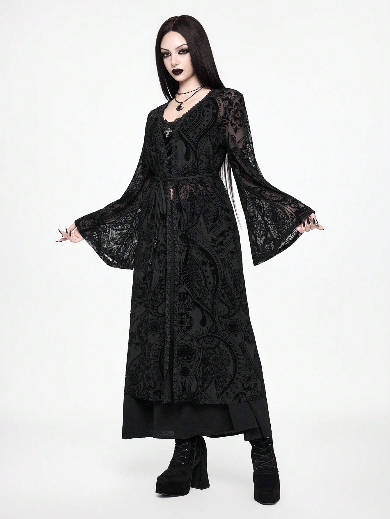 Boho Goth Dark Forbidden Forest Lace Flare Sleeve Sheer Cardigan