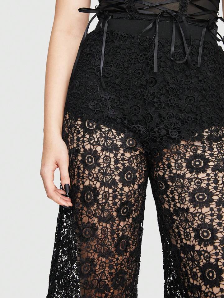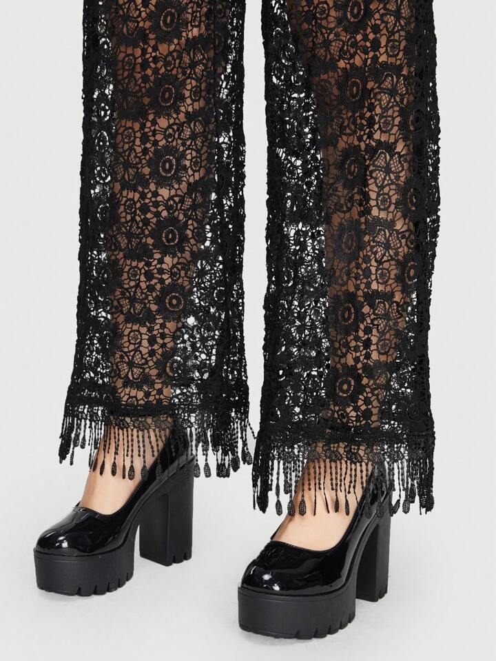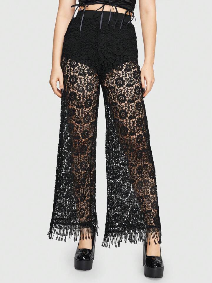 Boho Gothic Style Wide Leg Pants For Women, Featuring Water Soluble Lace Hem, Mesh Panel And Tassel Detailing