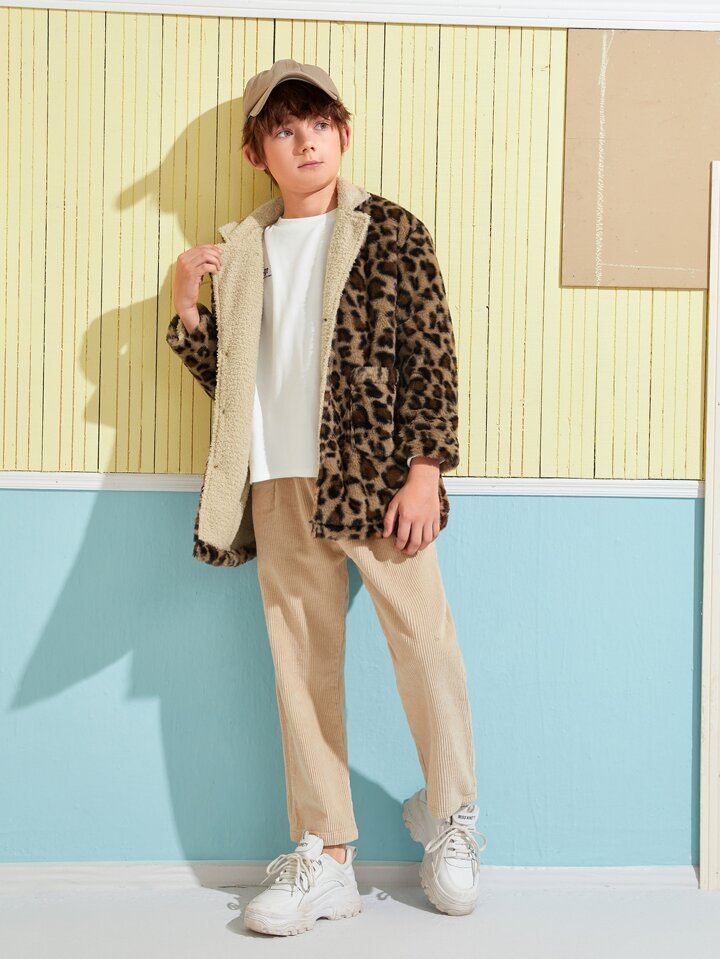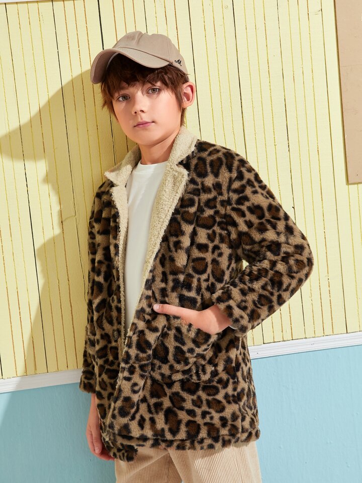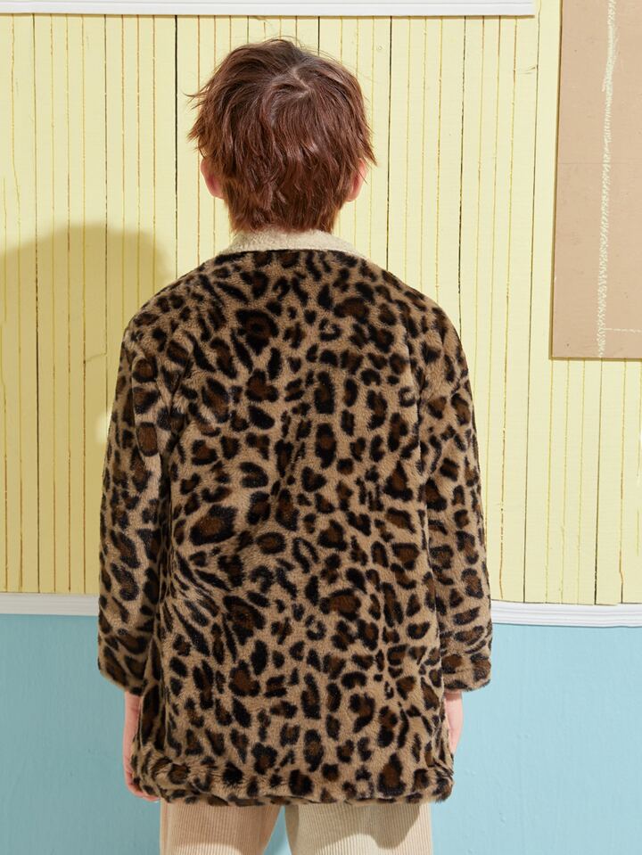 Boys Notched Collar Leopard Teddy Lined Fuzzy Coat
