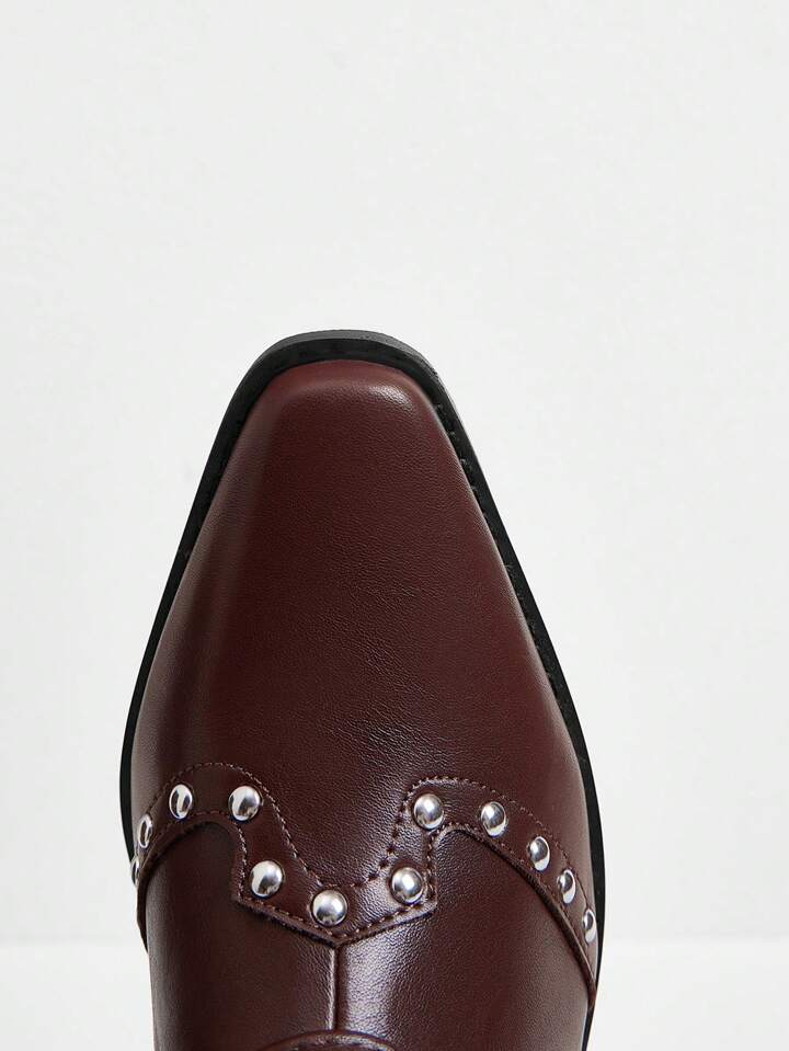 Brown Pointed Toe Riding Boots, Women Stylish Mid-Calf Boots With Rivets, New Design For Autumn/Winter