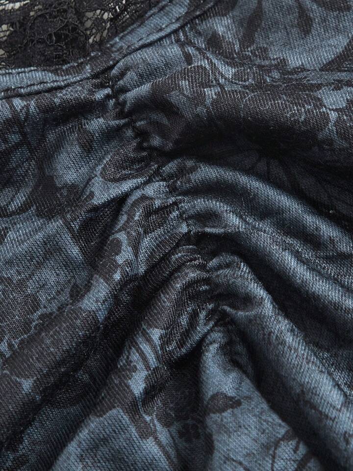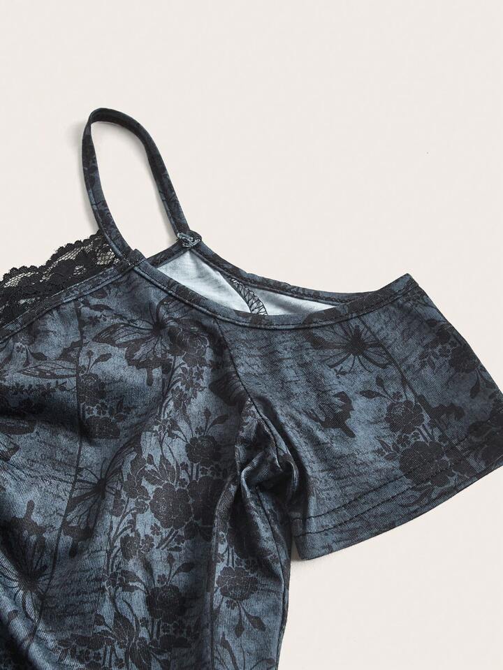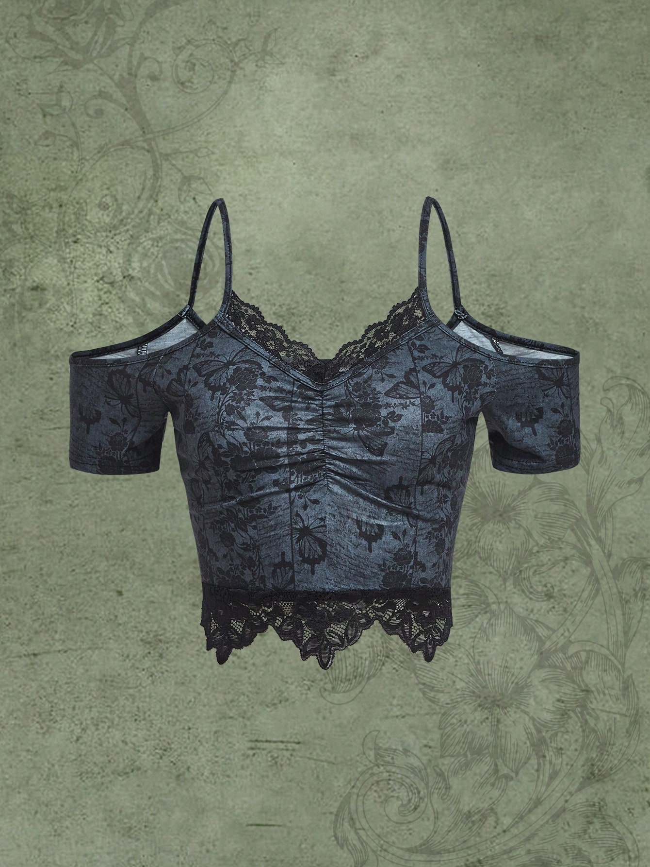 Butterfly Print Contrast Lace Cold Shoulder Ruched Crop Tee
