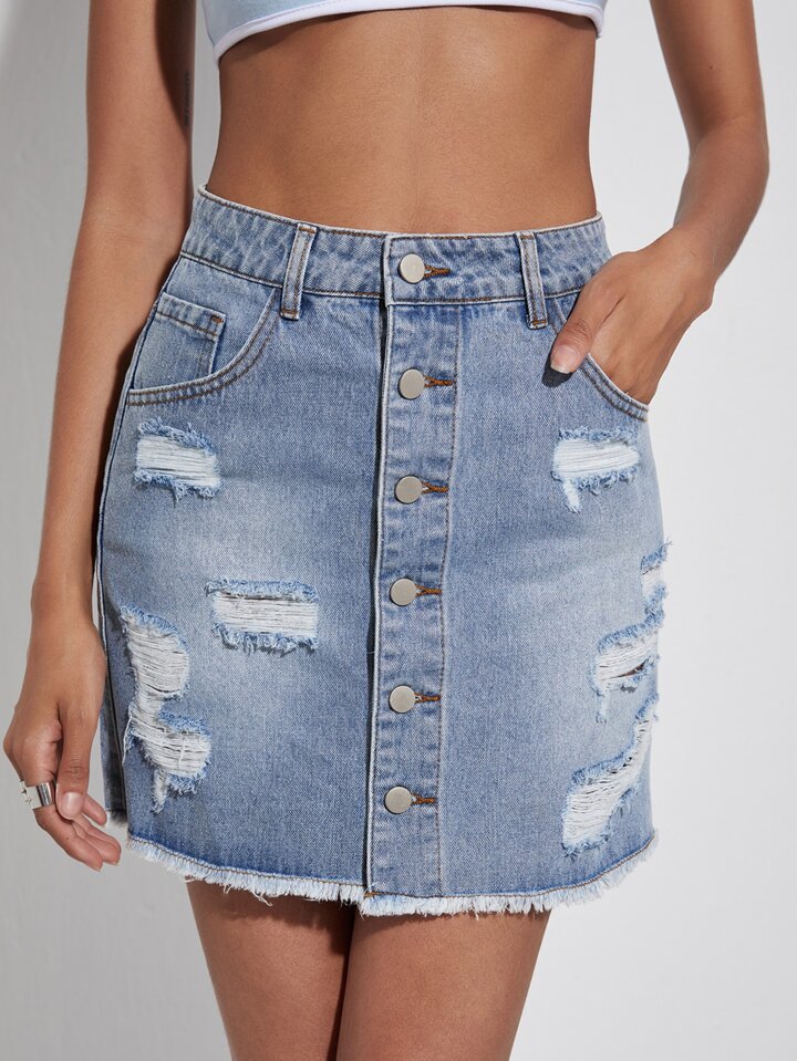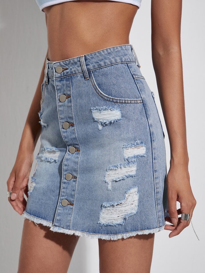 Button Front Ripped Detail Denim Skirt