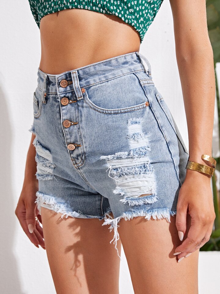 Buttoned Front Ripped Raw Hem Denim Shorts