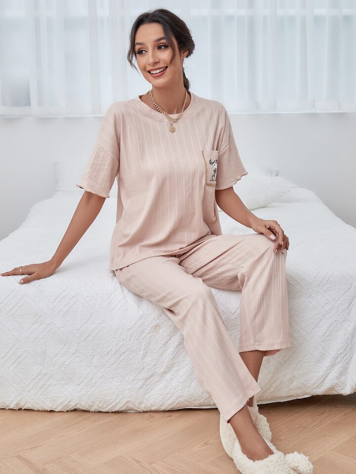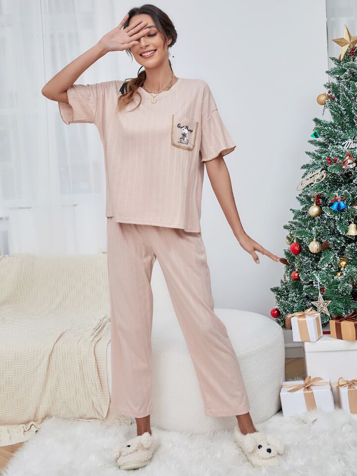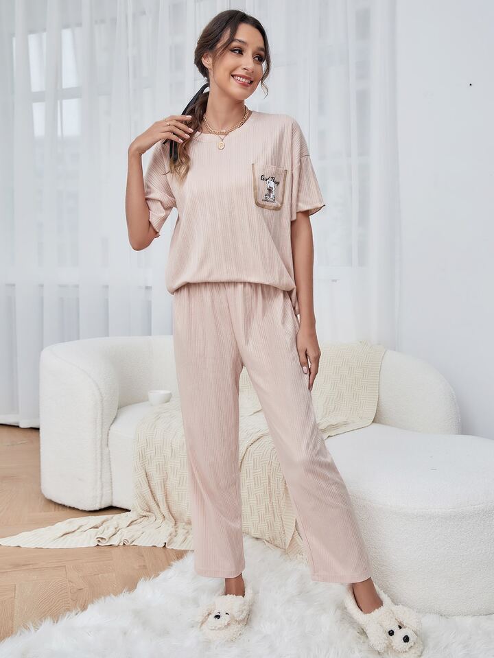 Cartoon And Letter Graphic Pocket Patched PJ Set