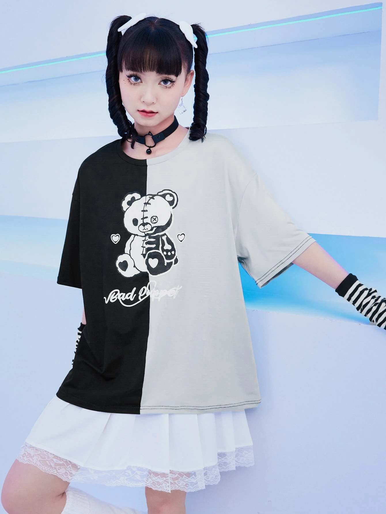 Cartoon Bear Graphic Colorblock Tee