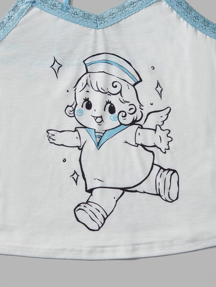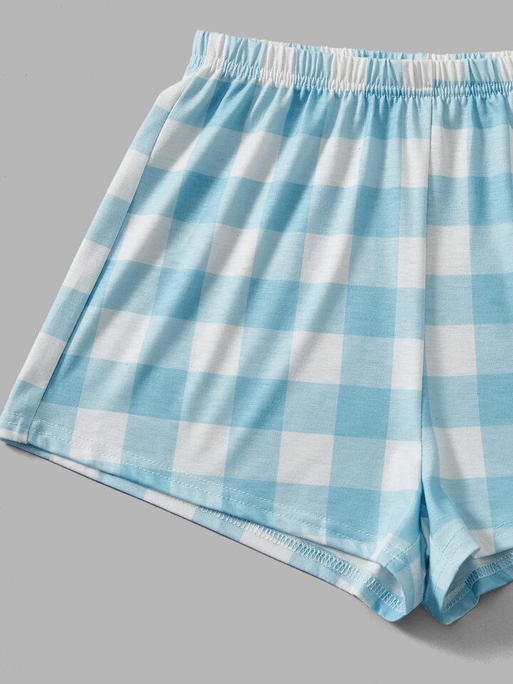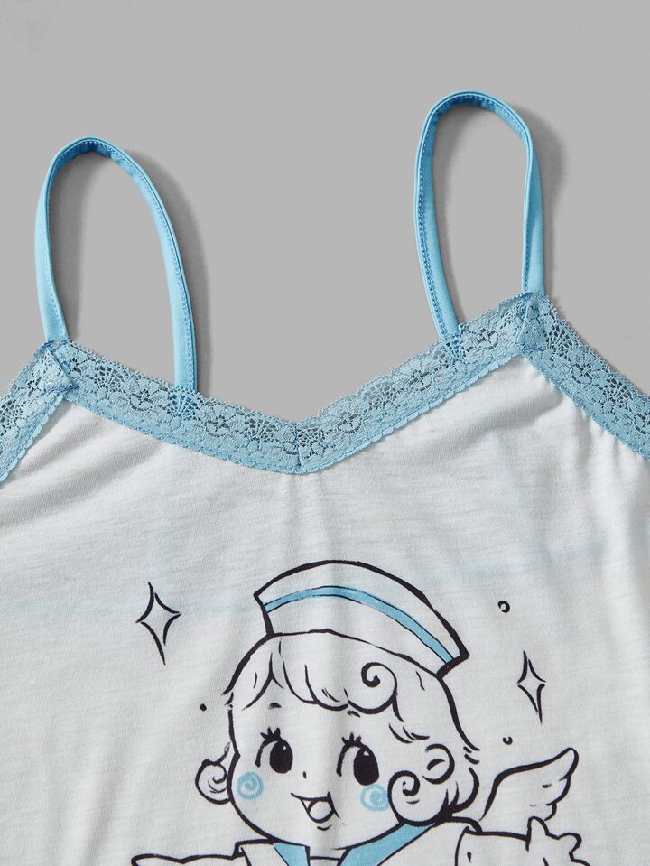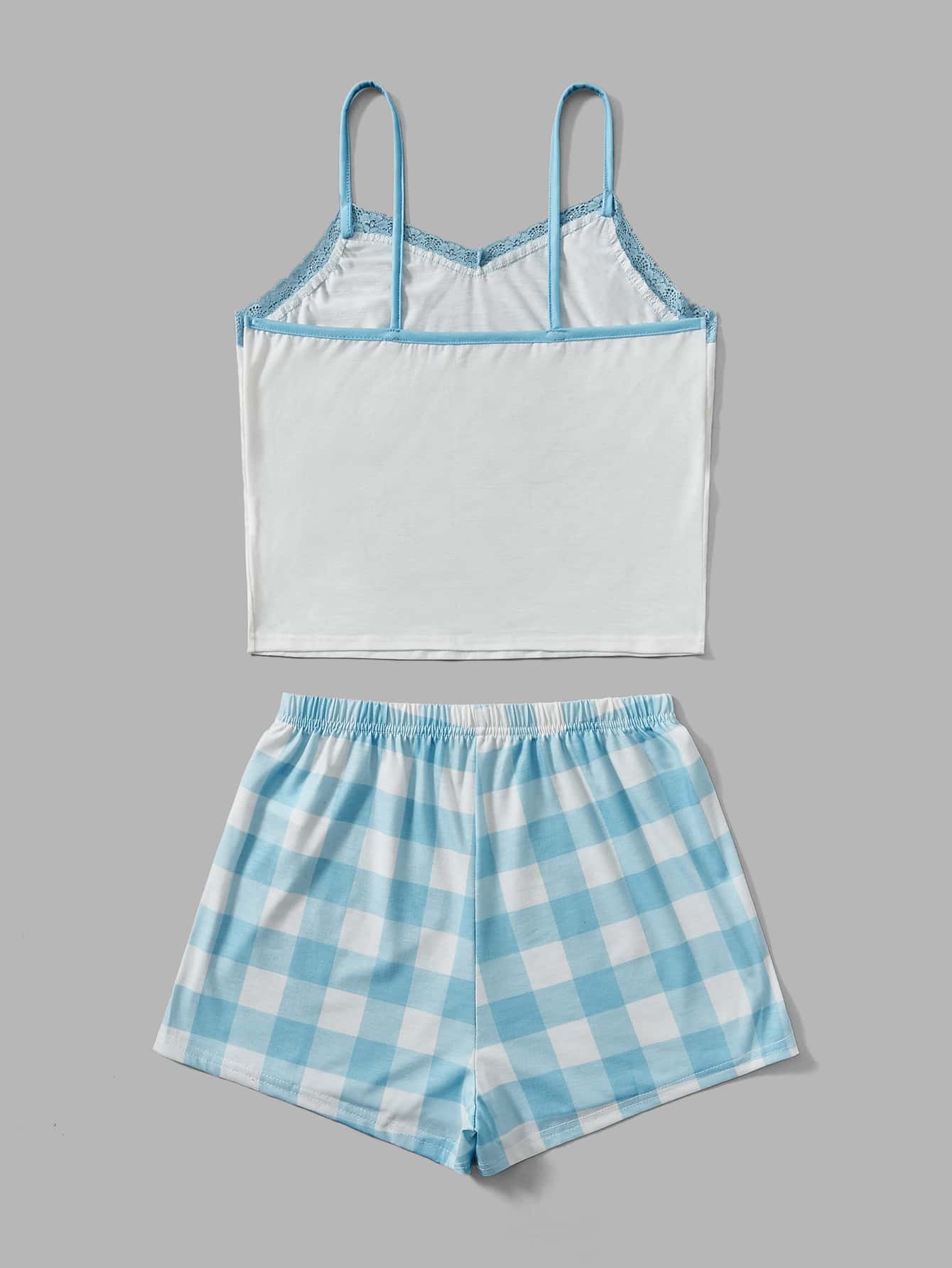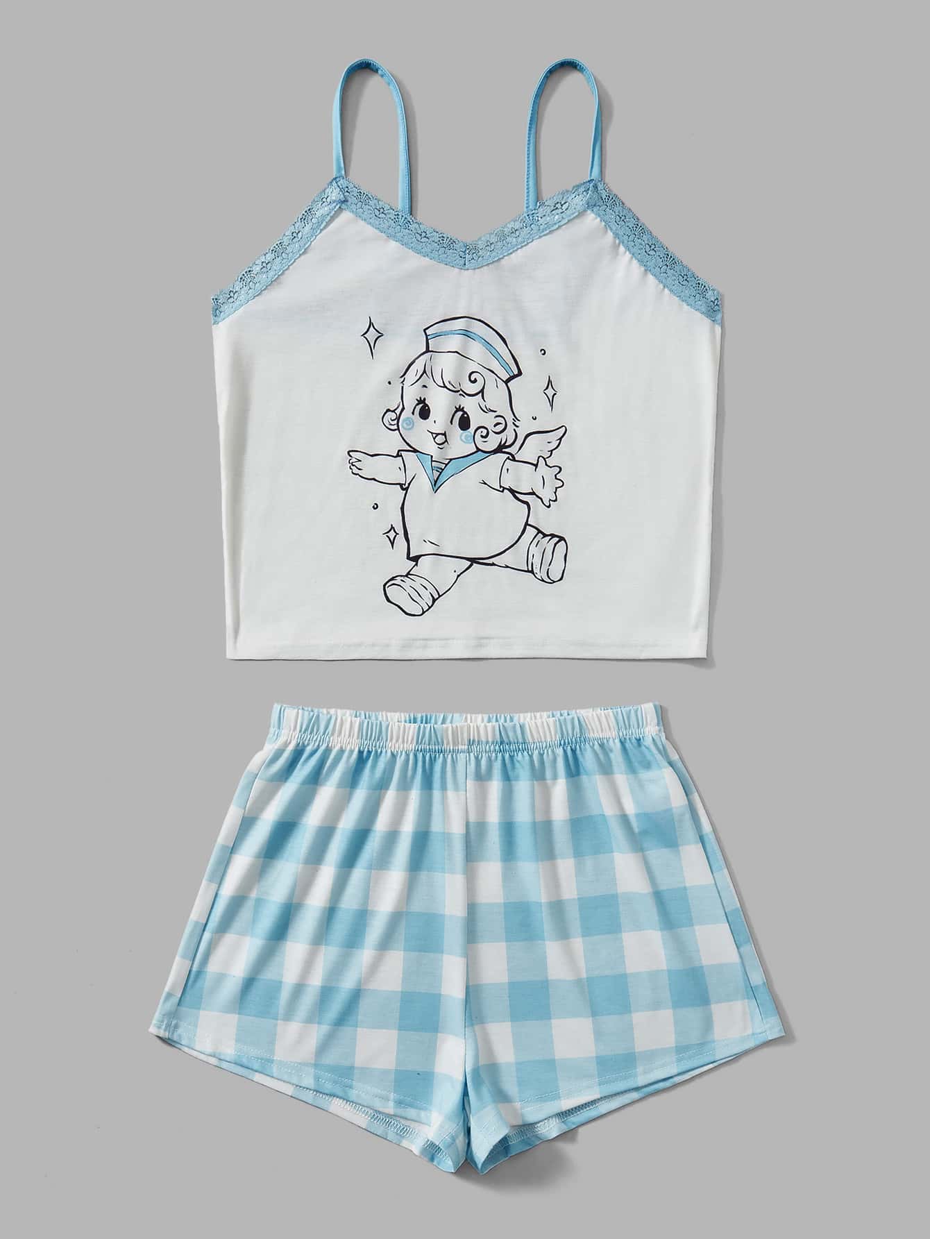 Cartoon Graphic Contrast Lace Cami Top & Gingham Shorts PJ Set