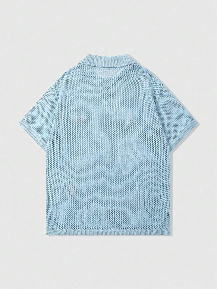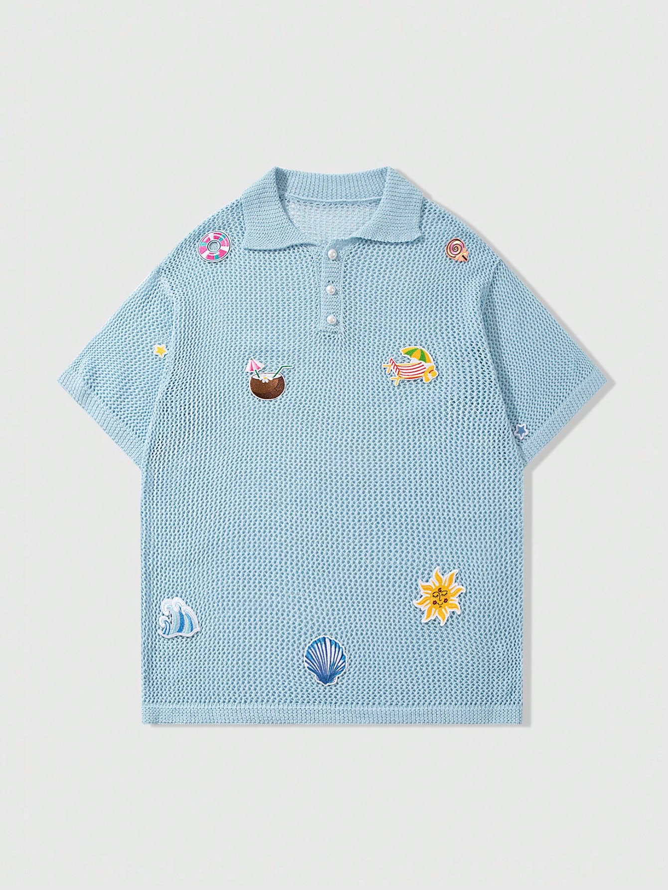 Casual Men's Floral Embroidery Half Open Collar Short Sleeve Cute Knit Top, Summer Vacation