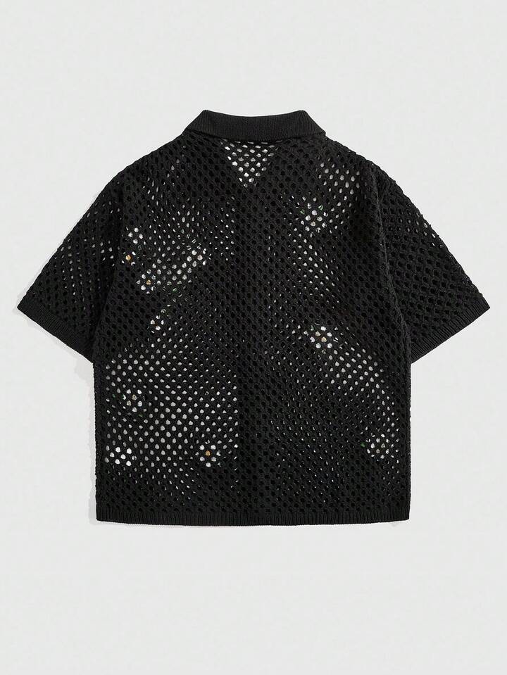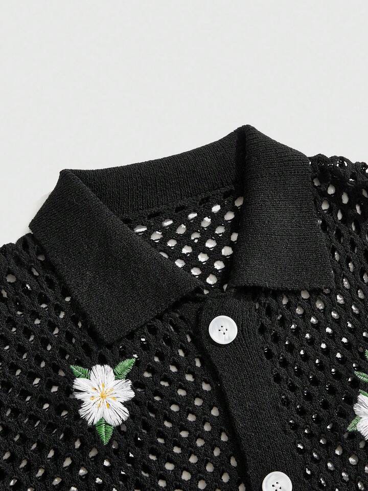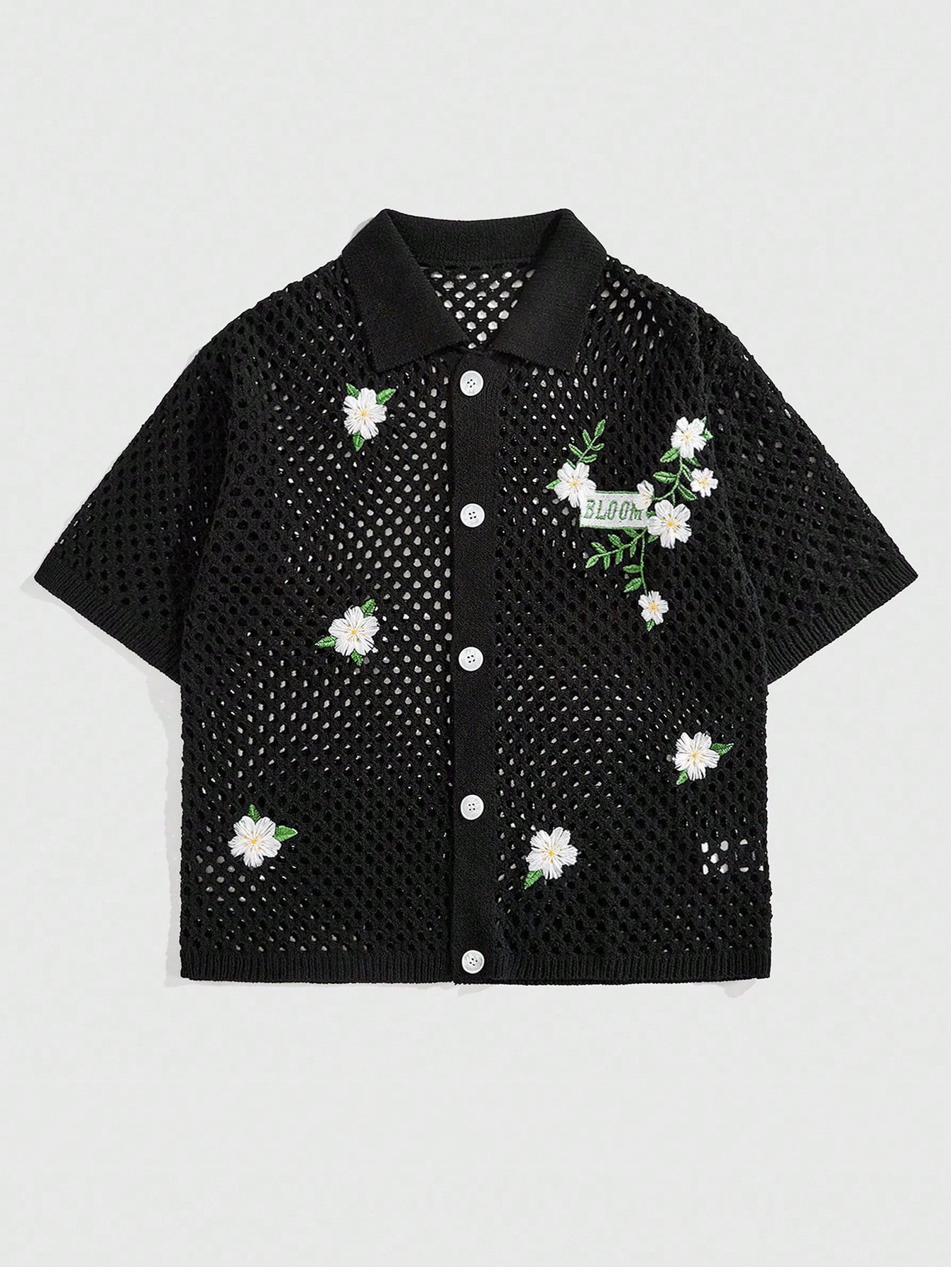 Casual Men's Floral Embroidery Loose Knit Shirt, Knit Short Sleeve Top