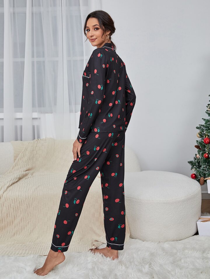 Cherry Print Contrast Piping Patched Pocket PJ Set