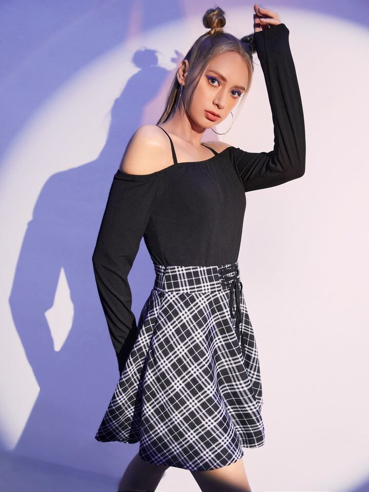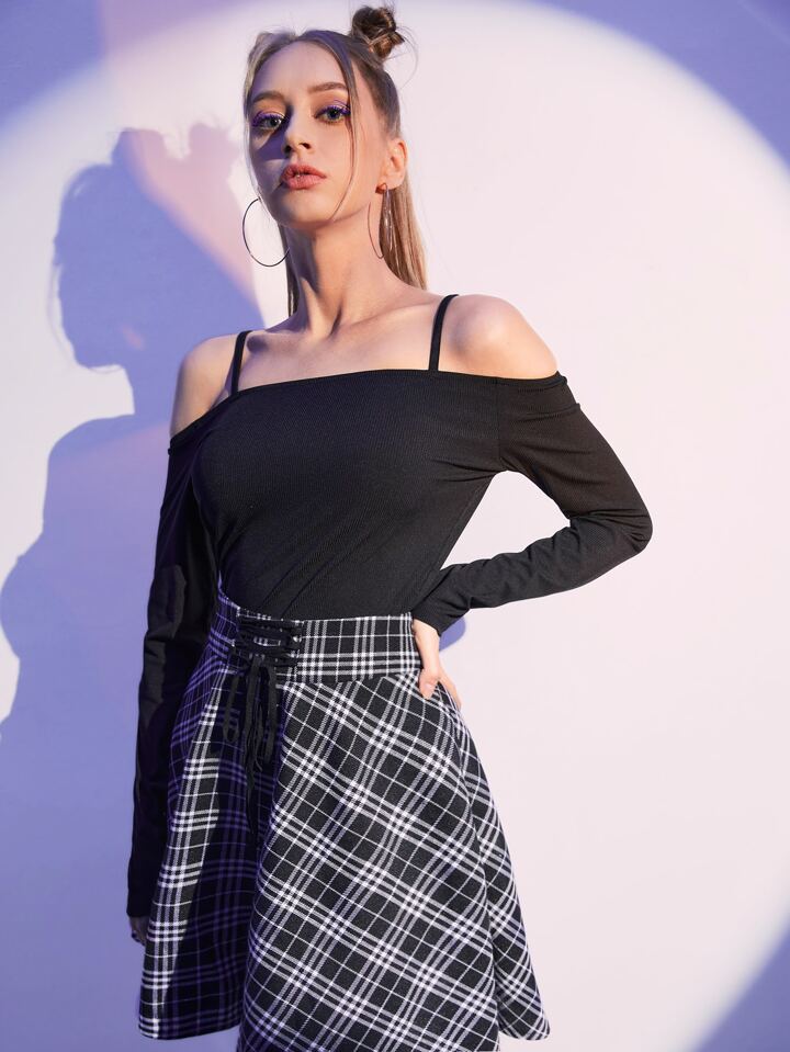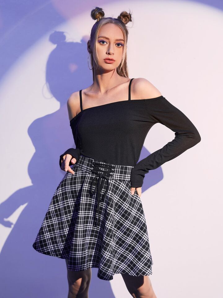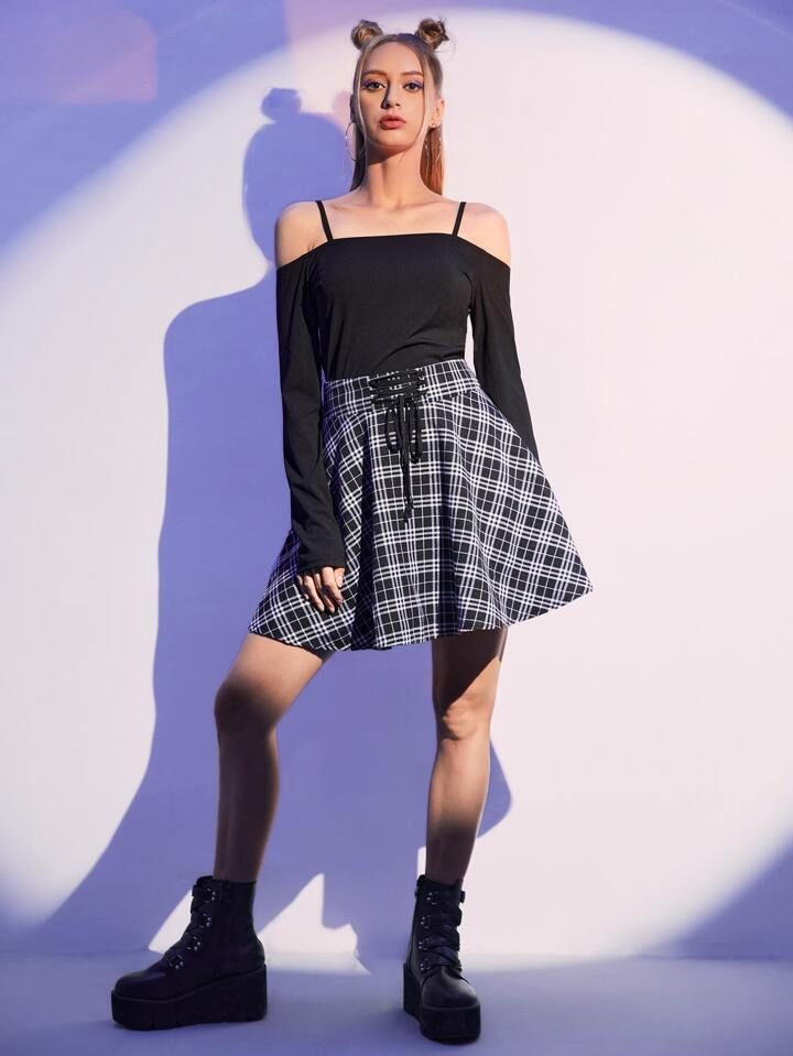 Cold Shoulder Tee & Lace Up Plaid Skirt