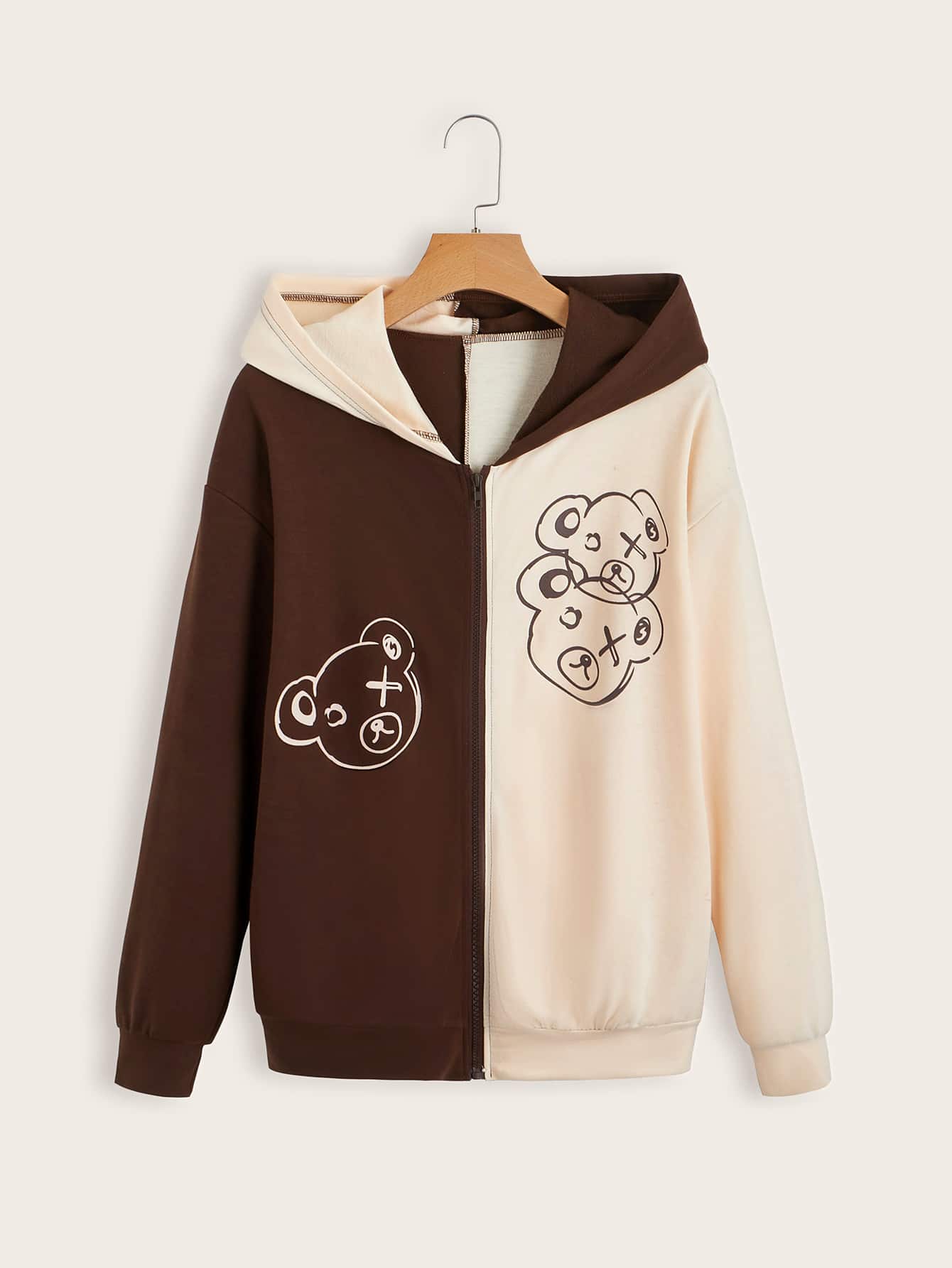 Color-block Cartoon Bear Graphic Zip Up Hoodie