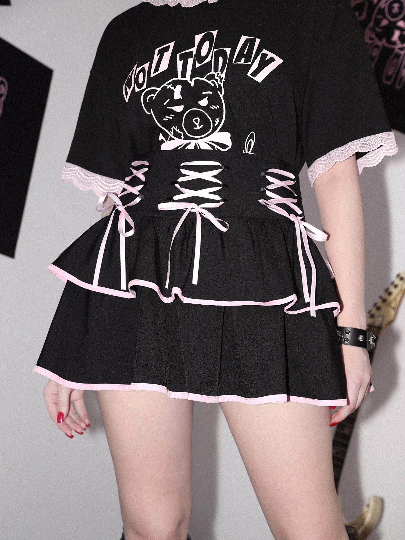 Contrast Binding Ruffle Hem Lace Up Waist Skirt