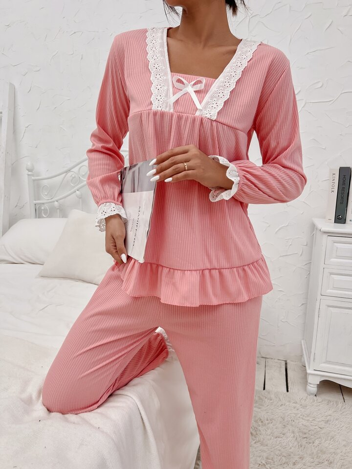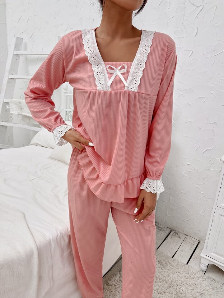 Contrast Eyelet Embroidered Ruffle Trim Bow Front PJ Set
