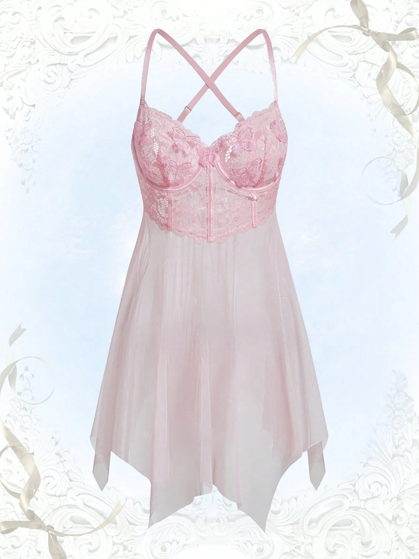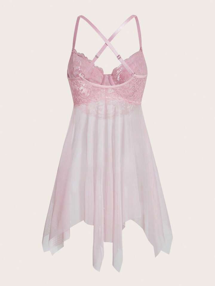 Contrast Lace Asymmetrical Hem Mesh Babydoll Dress