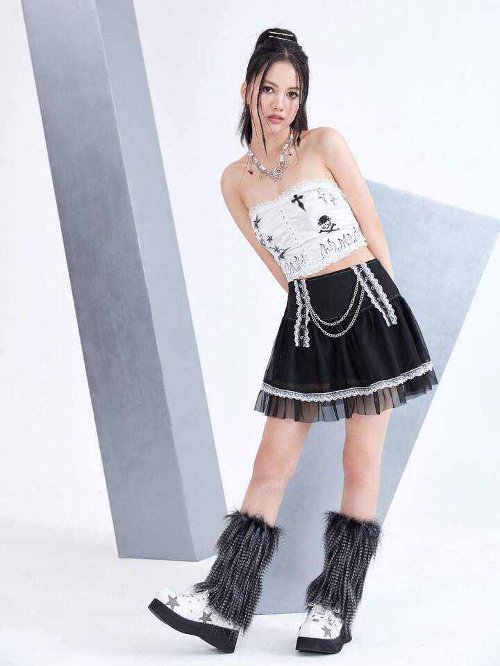 Contrast Lace Chain Decor Mesh Skirt