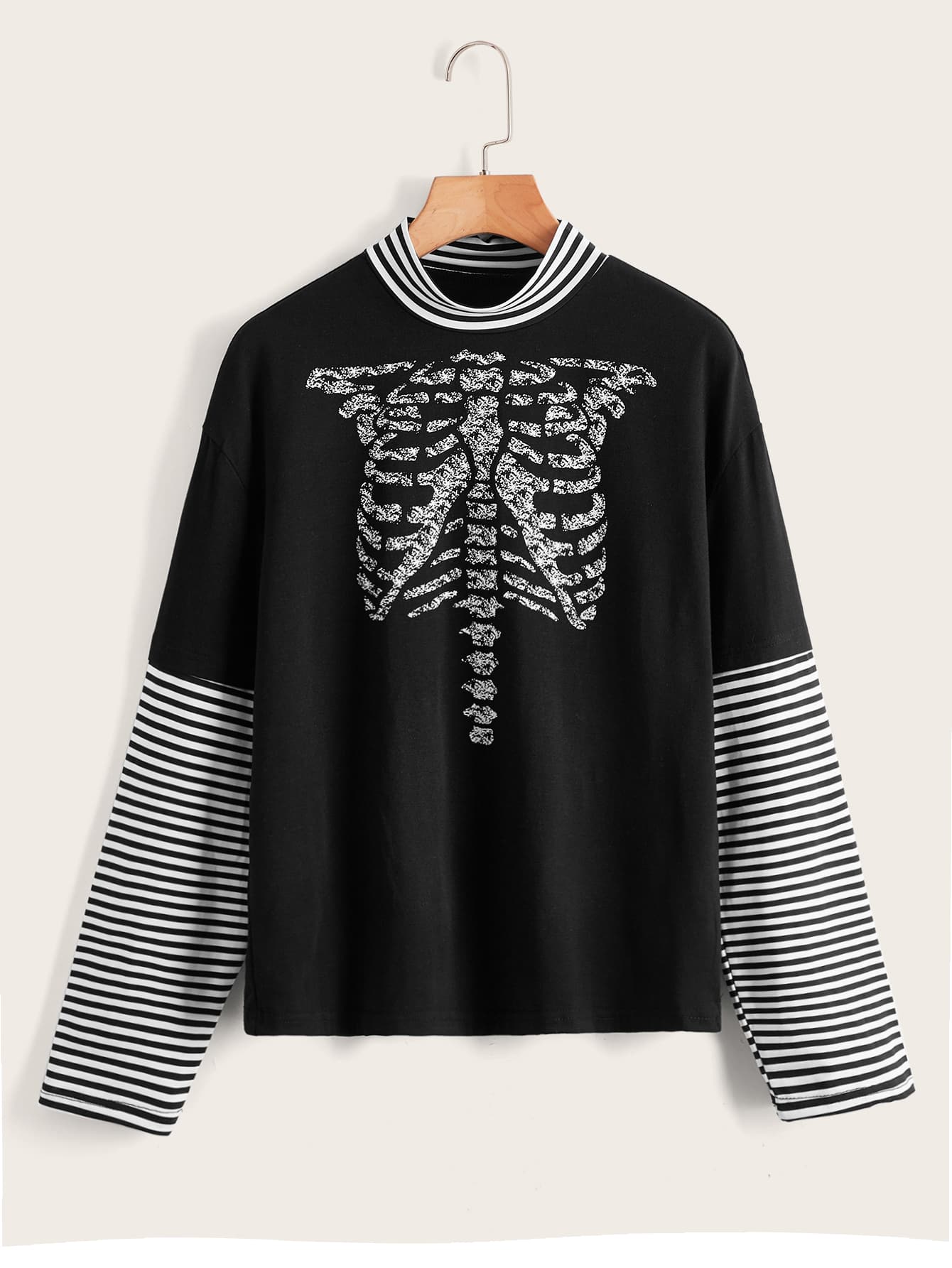 Contrast Striped Sleeve Skeleton Graphic Tee